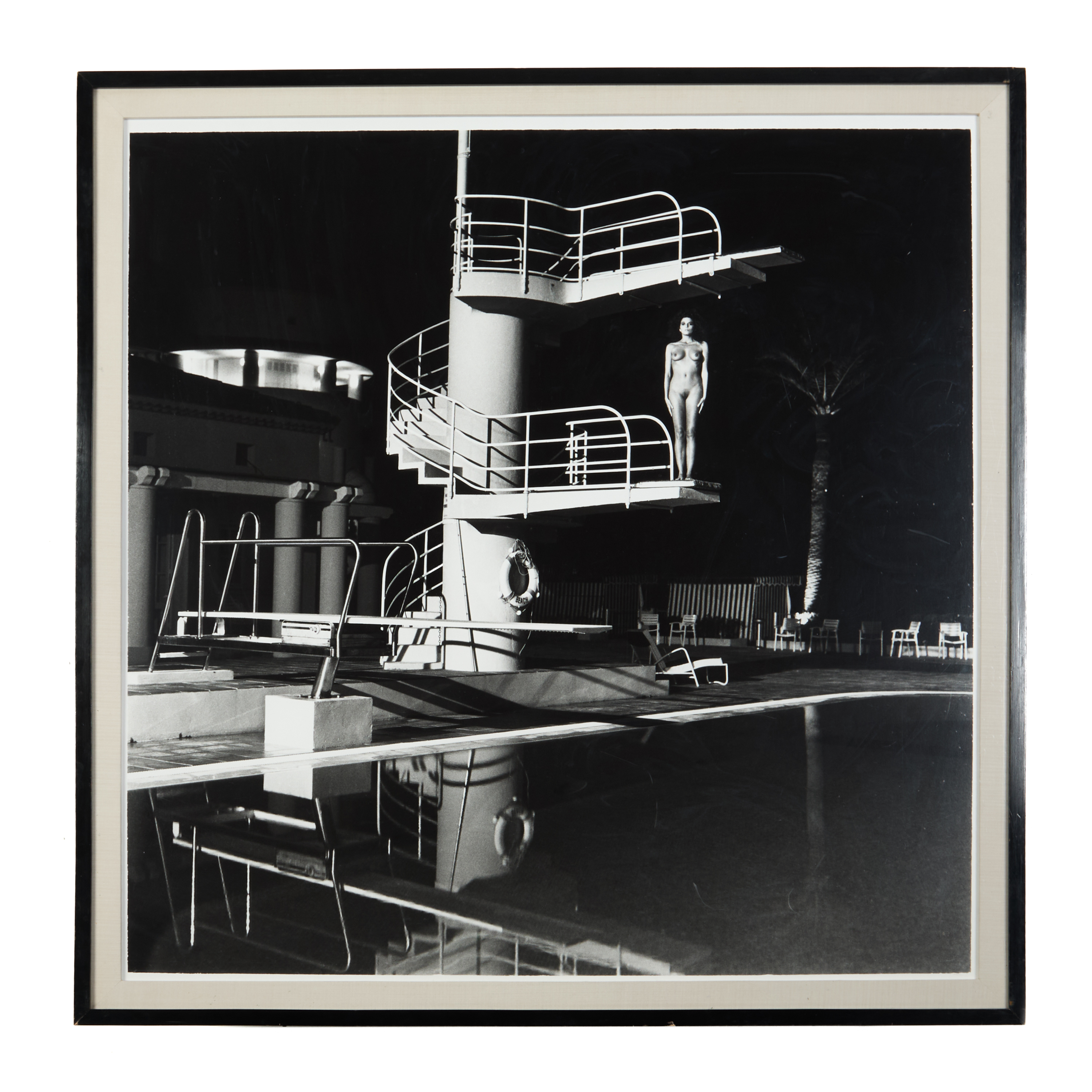 Diving Tower, Old Beach Hotel, Monte Carlo appartient à un célèbre ensemble de photographies à grande échelle réalisées au début des années 1980 sur la Côte d'Azur, où Newton est revenu à plusieurs reprises sur les thèmes des loisirs, du pouvoir et de l'exposition. La géométrie austère de la structure de plongée et la pose rigide du mannequin par rapport à l'horizon méditerranéen ouvert et sombre, transforment le site de récréation en une scène. L'image est à la fois cinématographique et légèrement inquiétante. Elle est typique de la capacité de Newton à imprégner les lieux d'un drame latent.