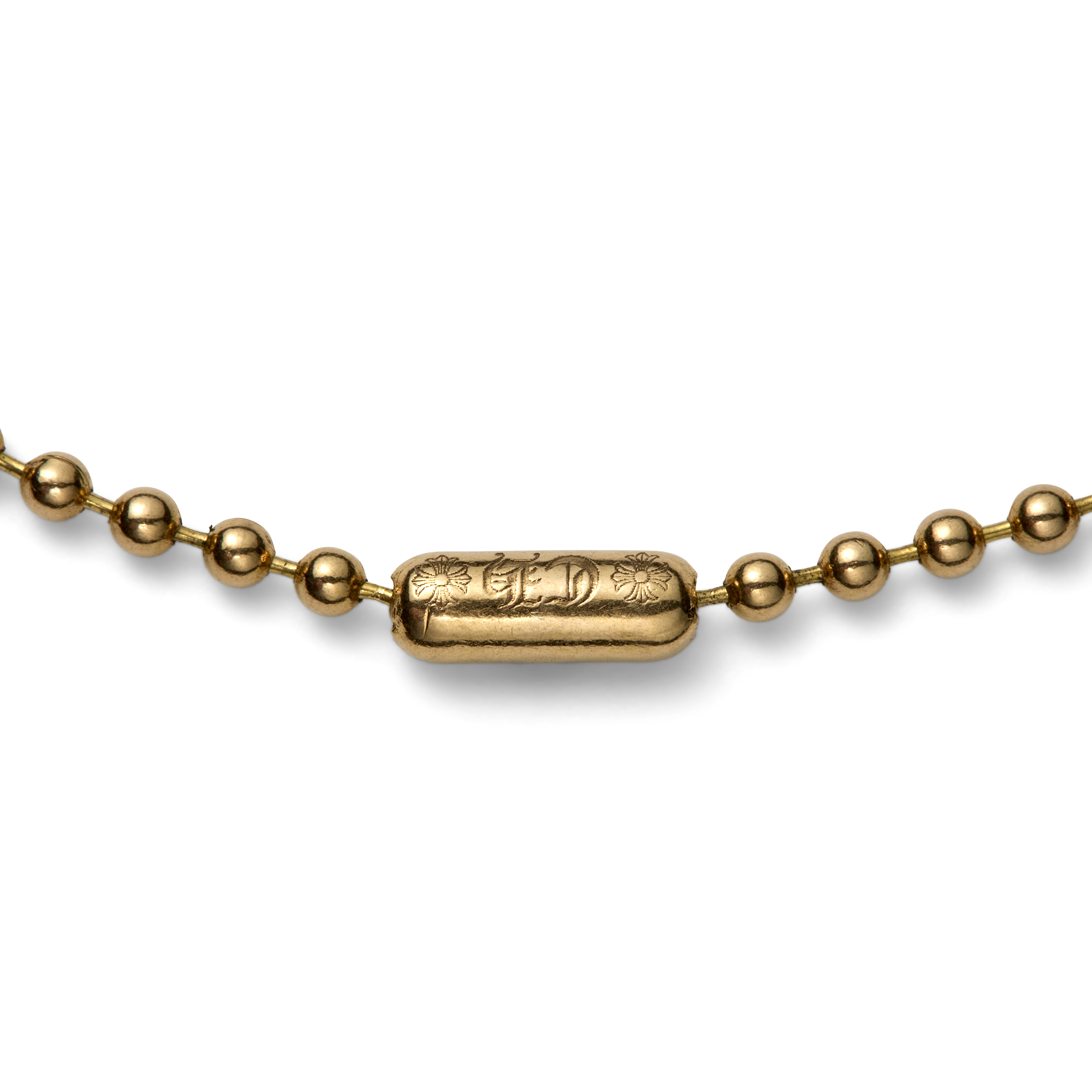 Gifted by Karl Lagerfeld to Sébastien Jondeau as part of his gold Chrome Hearts suite, the necklace fuses symbolic weight with personal provenance. The dog tag format lends the piece an intimacy and physical closeness, reinforcing its function as both adornment and talisman — jewelry chosen with intention rather than spectacle, and worn as an extension of identity.
