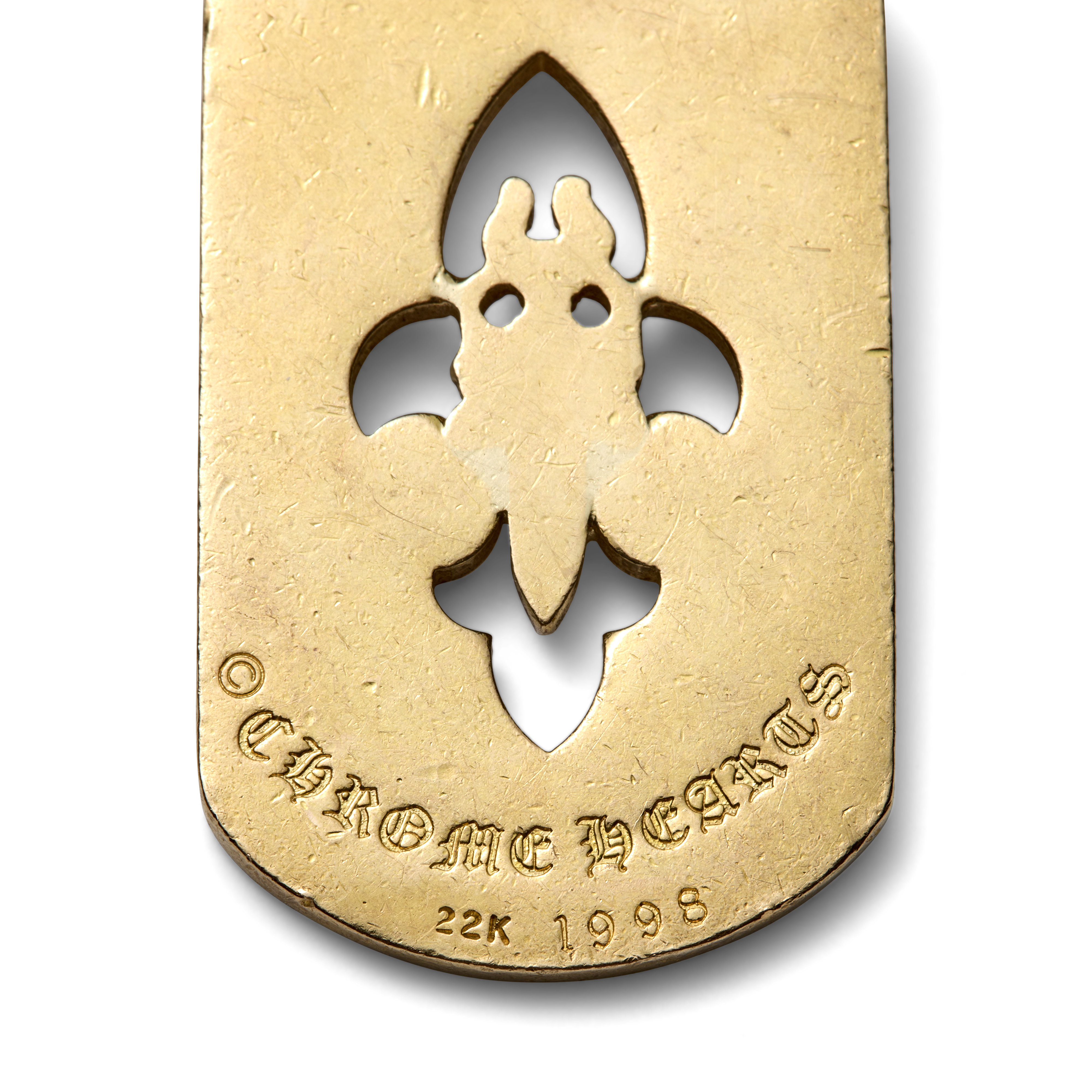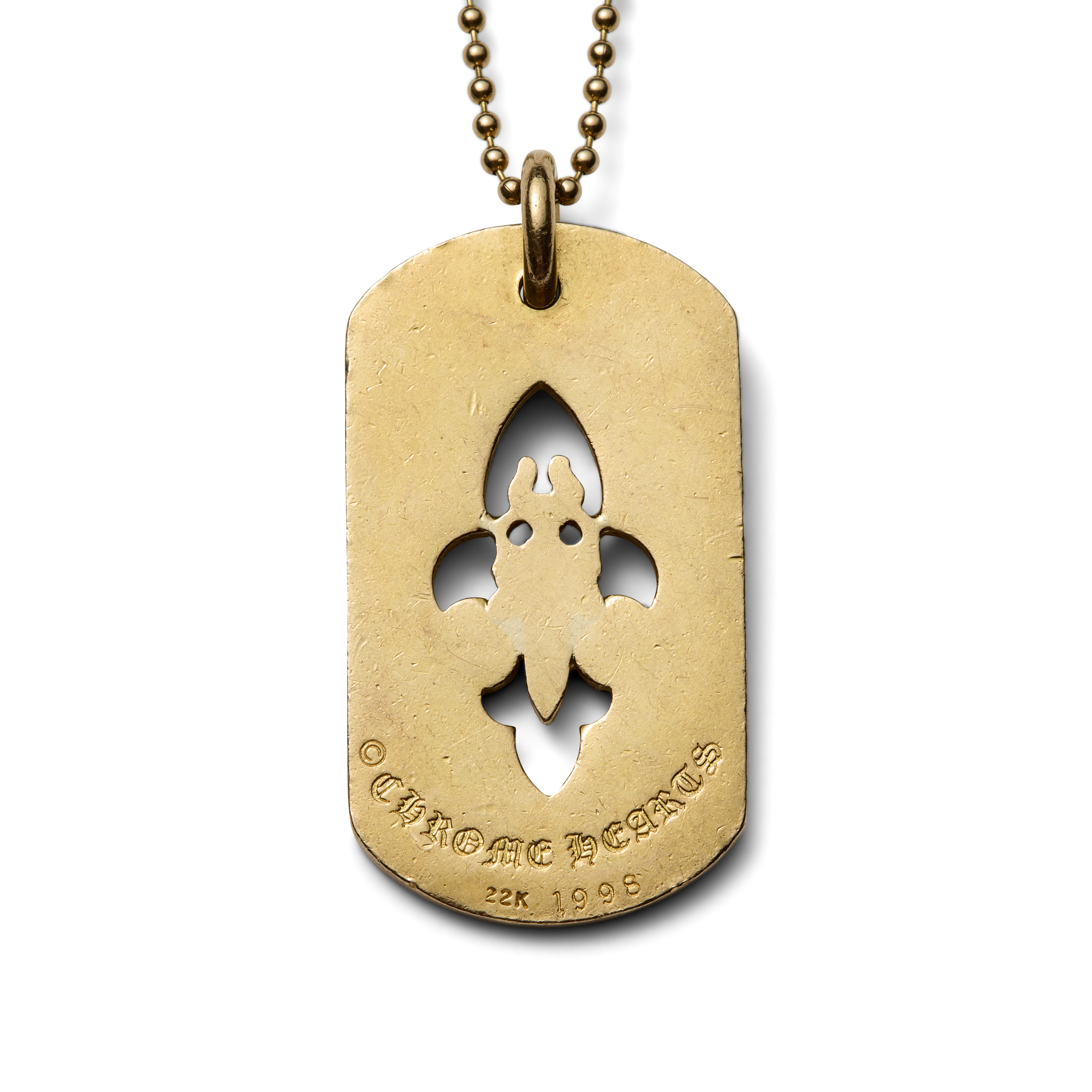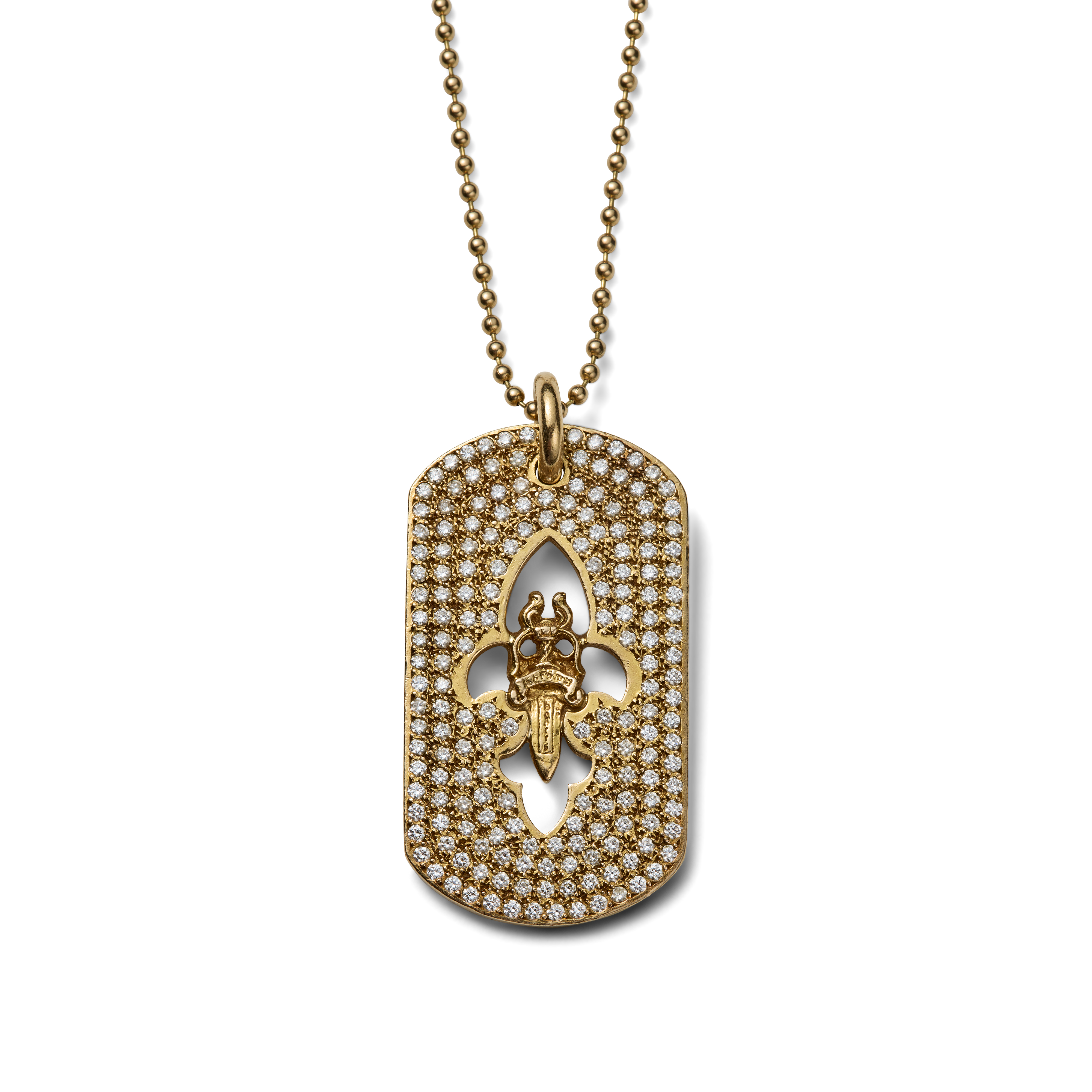 This detachable rectangular dog tag pendant is executed in 22-karat yellow gold and pavé-set with approximately 183 round brilliant-cut diamonds, weighing approximately 4.63 carats total (G–H color, VS clarity). The surface is articulated with Chrome Hearts’ signature openwork sword and fleur-de-lis motifs, combining medieval iconography with the house’s distinctly modern, subversive language. The pendant is suspended from a 22-karat gold ball-link chain measuring 30 inches (76.2 cm), allowing it to sit with deliberate presence on the body.