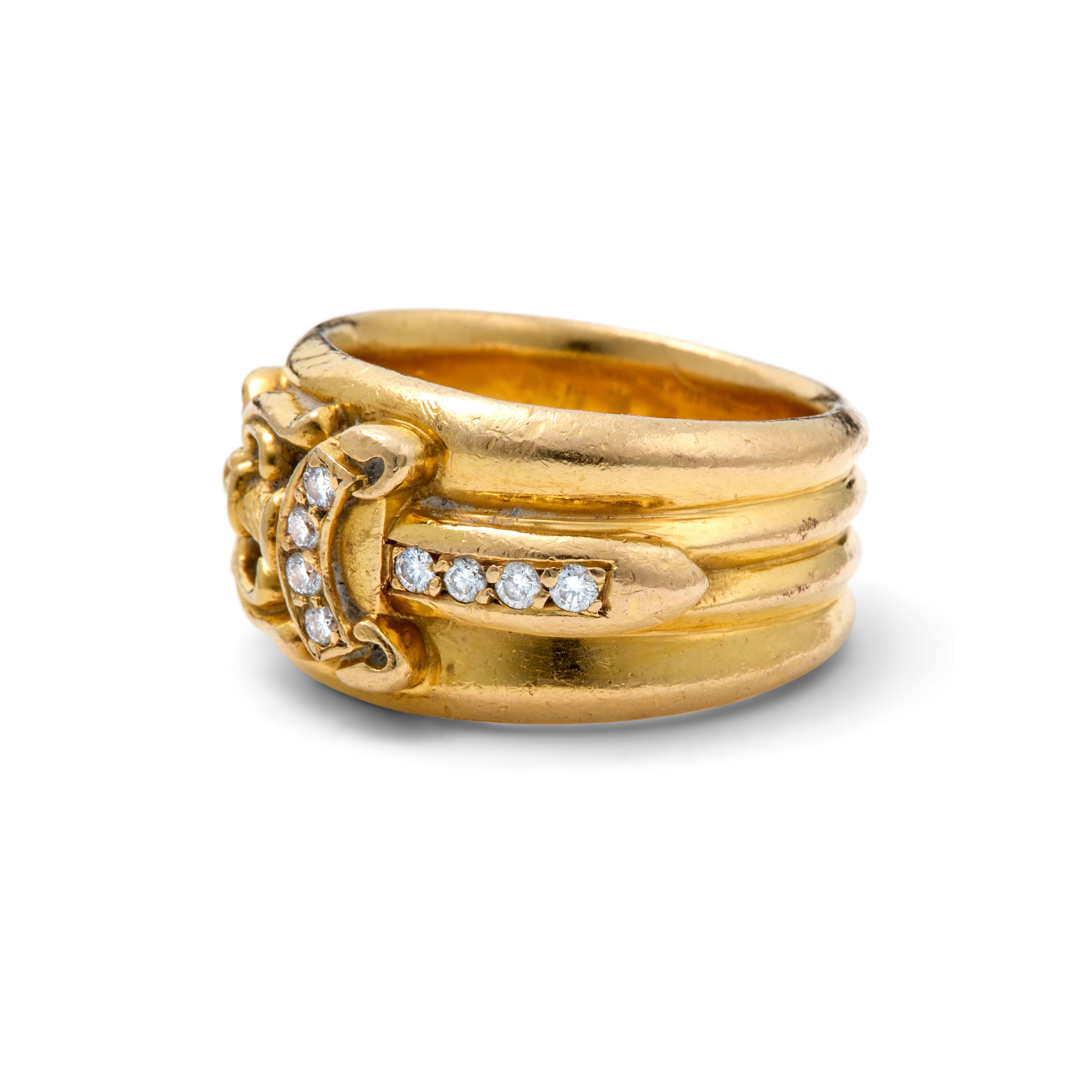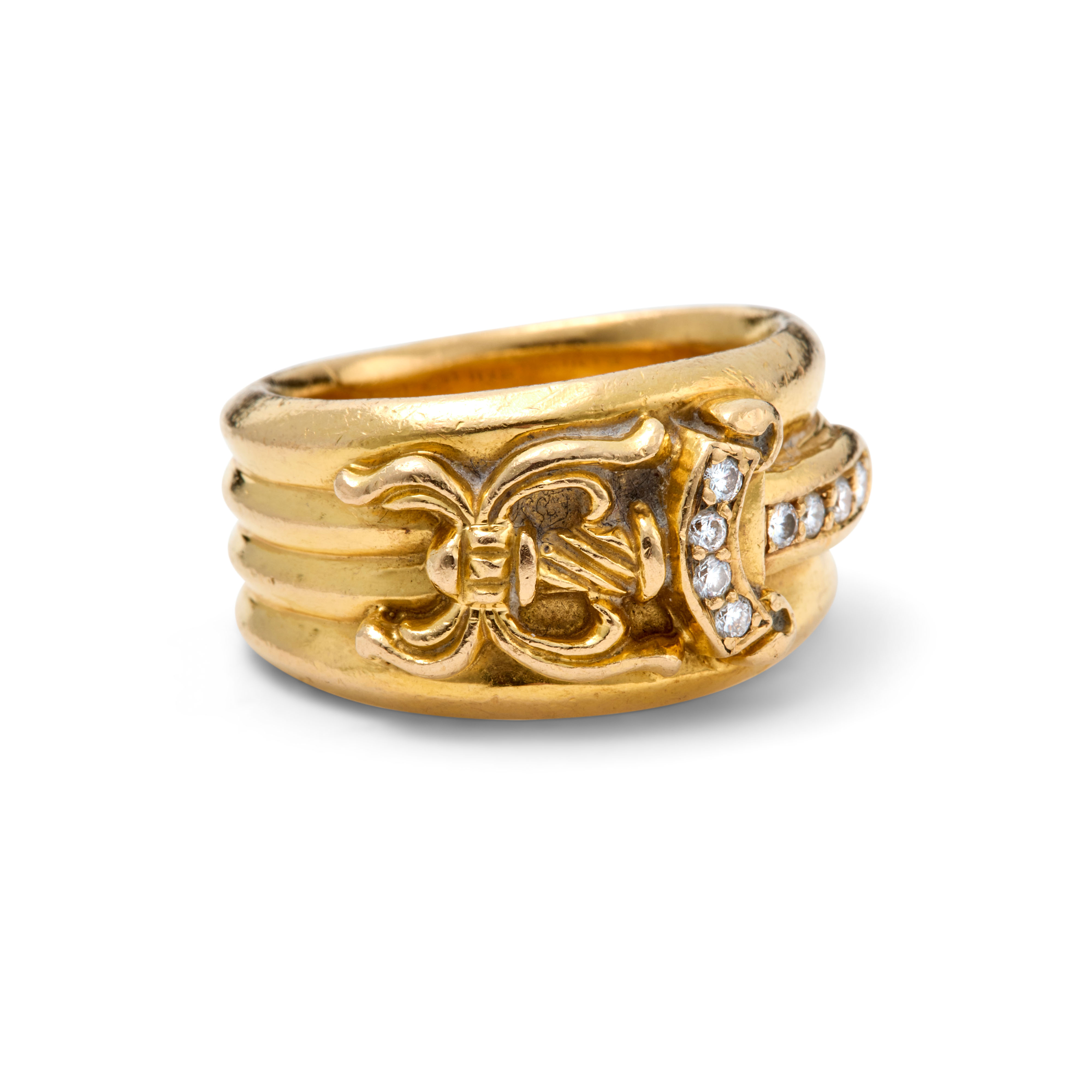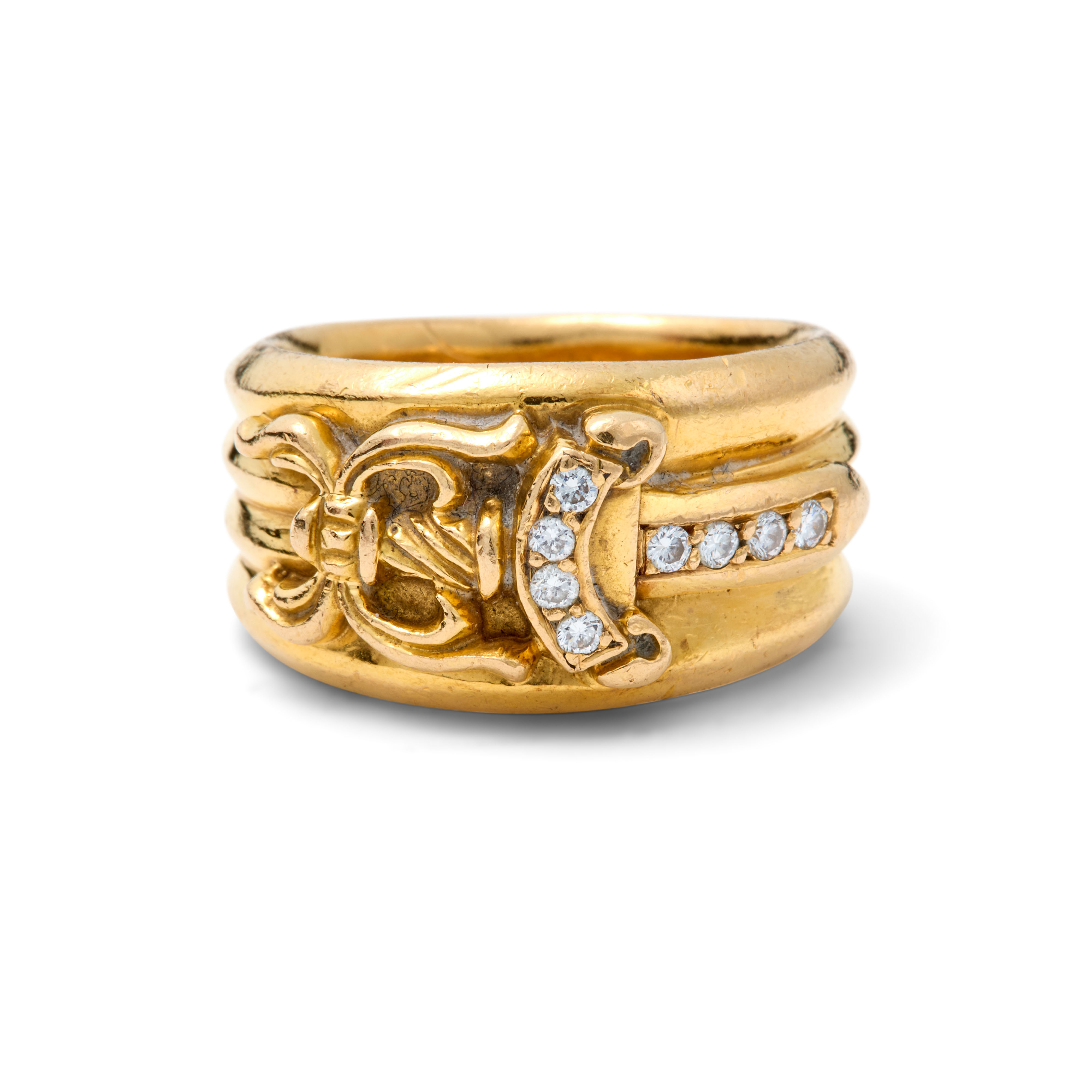 Of tapering form, this ring is crafted in 22-karat yellow gold and set with round brilliant-cut diamonds weighing approximately 0.24 carat total (G–H color, VS clarity). The design incorporates Chrome Hearts’ signature sword motif, rendered in miniature relief and punctuated with diamond accents, balancing restraint with symbolic force. The ring weighs 33.43 grams and is sized approximately US 10½, giving it strong material presence despite its compact scale.
