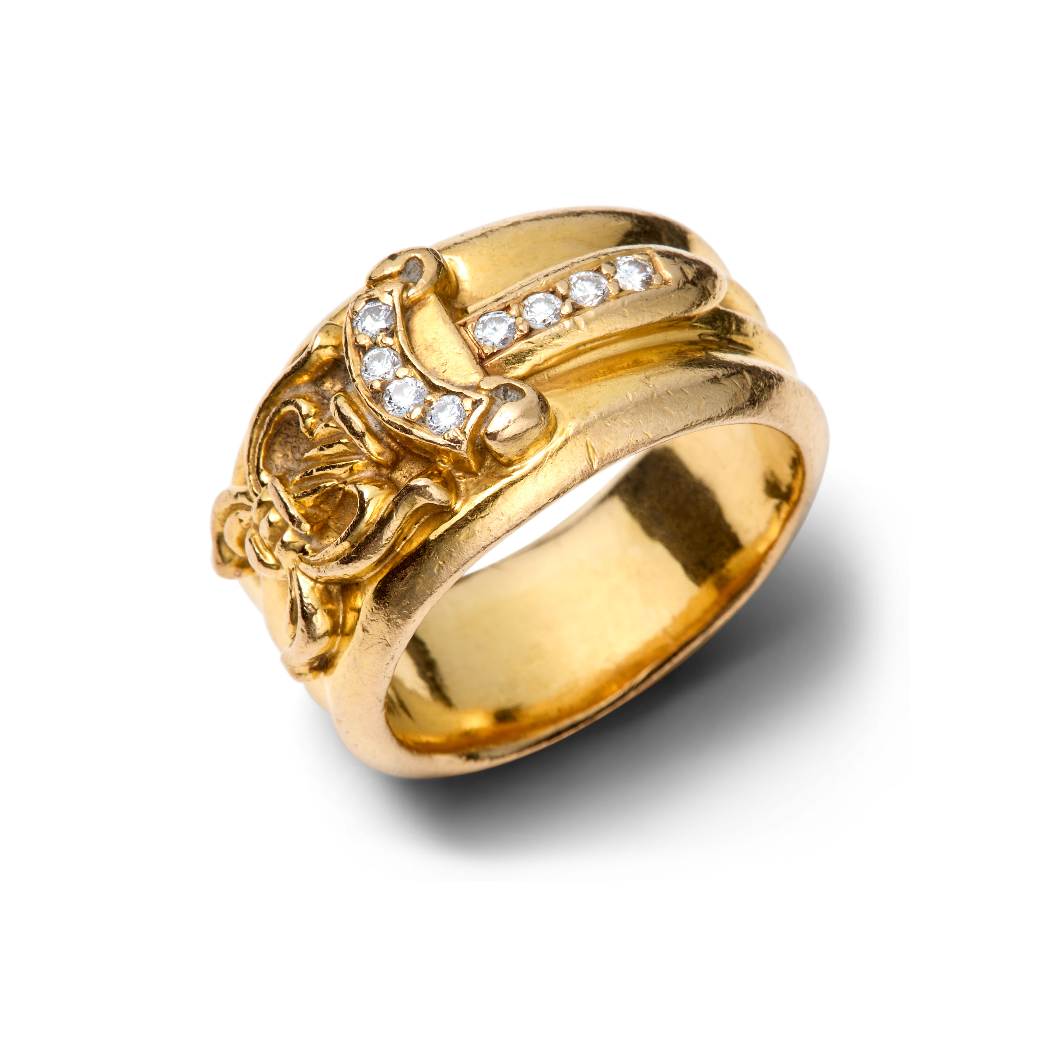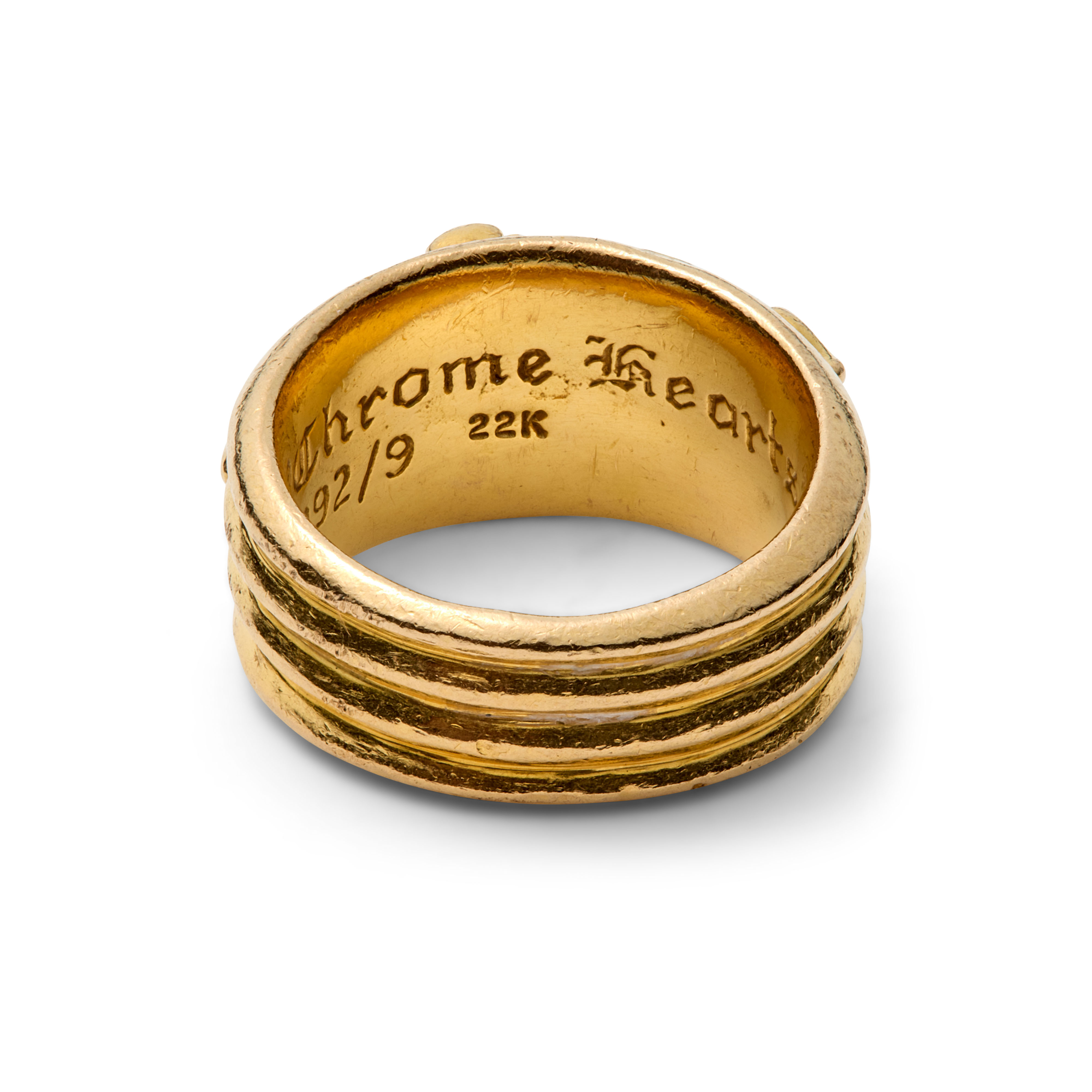 Signed Chrome Hearts, dated 1992/9, and stamped 22K, the ring belongs to the gold Chrome Hearts suite gifted by Karl Lagerfeld to Sébastien Jondeau. Lagerfeld regarded Chrome Hearts jewelry not as seasonal accessories but as enduring objects.