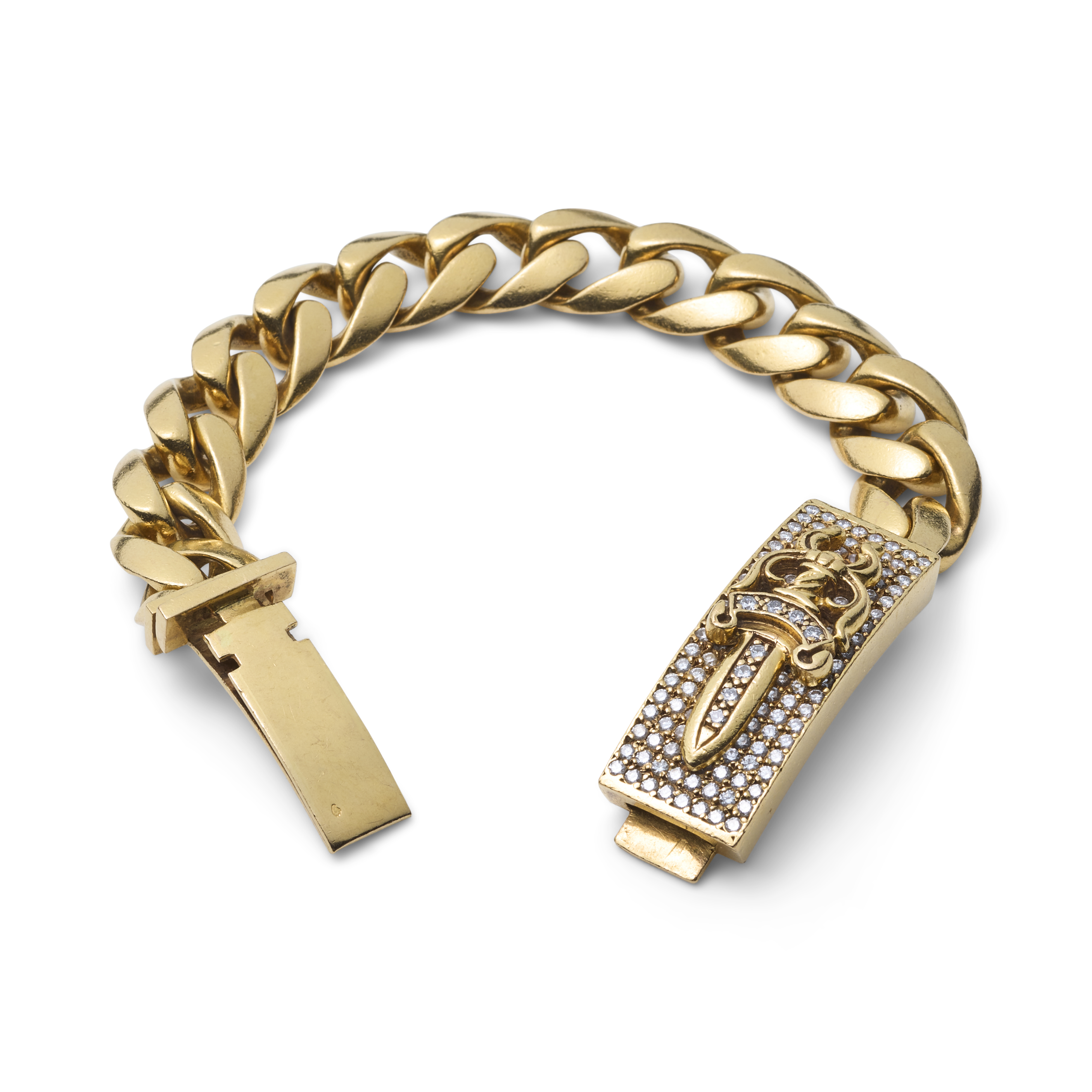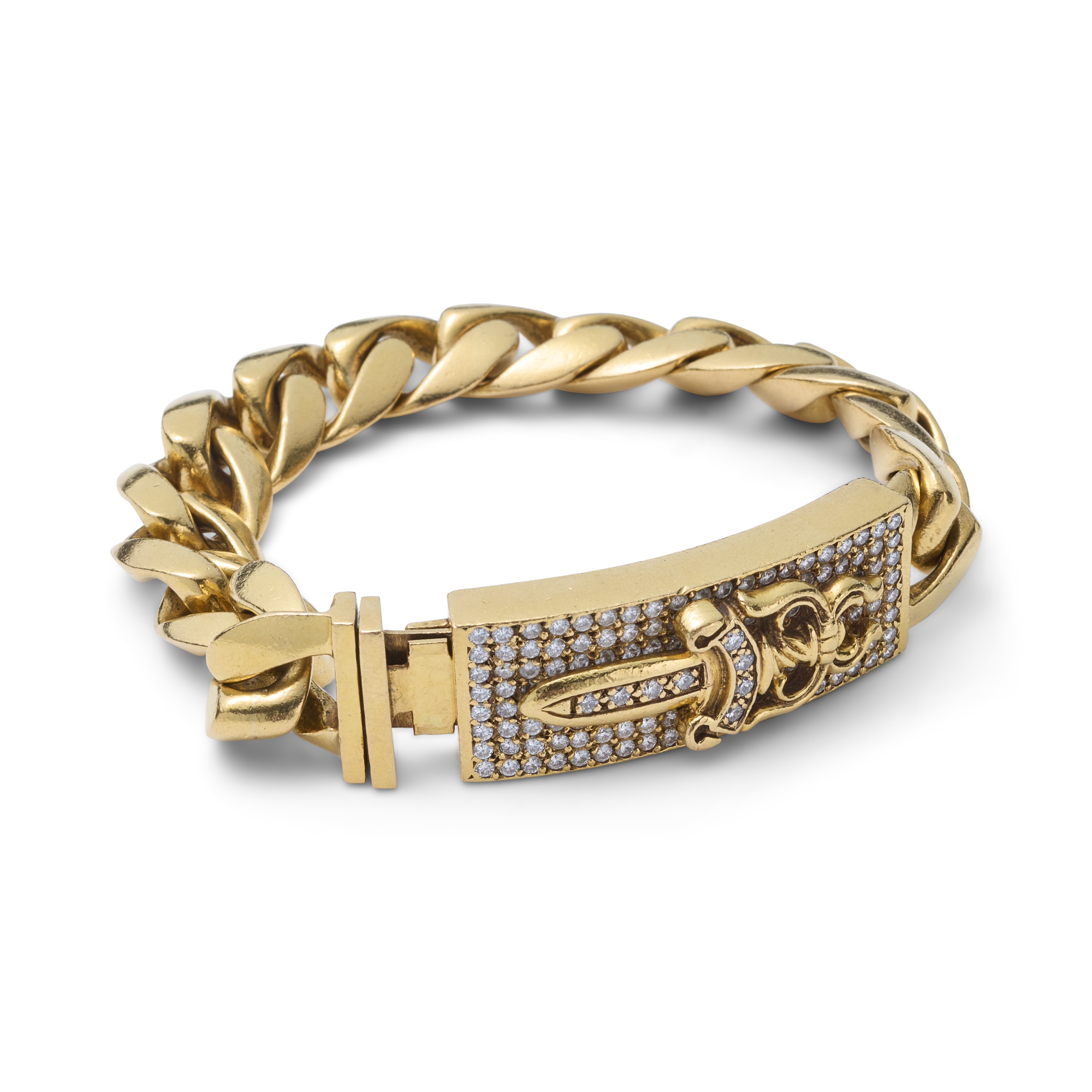 Crafted in 22-karat yellow gold, the bracelet’s handset with approximately 125 round brilliant-cut diamonds, weighing approximately 4.00–5.00 carats total (G–H color, VS clarity), infusing a rough-hewn rocker staple with an unexpected grandeur. The piece is anchored by a rectangular plaque clasp embellished with Chrome Hearts’ signature sword motif and pavé-set with diamonds, reinforcing the brand’s unmistakable visual language.