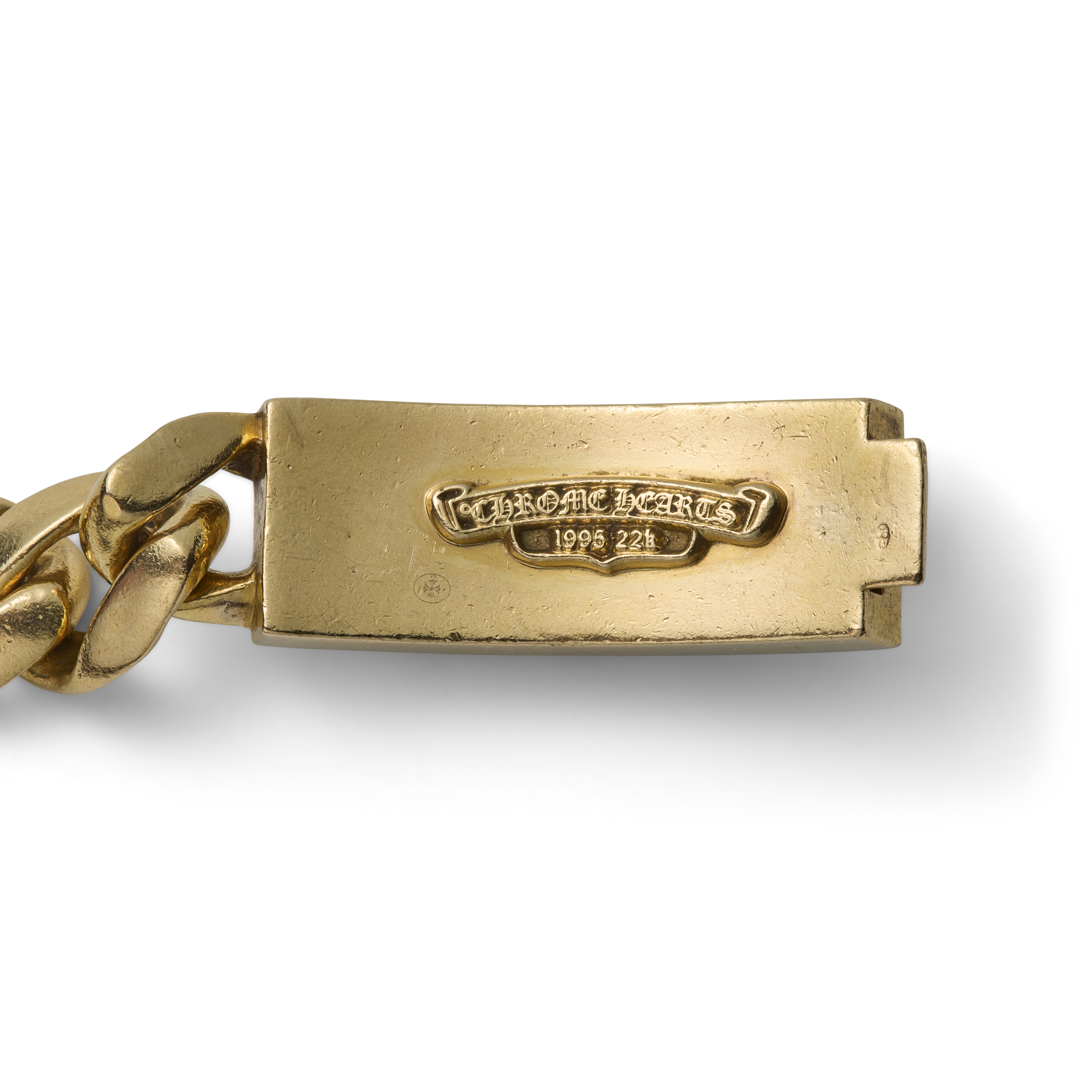 As one of a suite of gilded Chrome Hearts gifts Lagerfeld bestowed upon Jondeau over the years, the bracelet speaks to both craftsmanship and personal resonance. Lagerfeld himself rarely wore yellow gold—his own style favoring monochromatic black and silver—so his choice of this lustrous, diamond-studded piece for Jondeau was deliberate and intimate. Signed Chrome Hearts, dated 1995, and stamped 22K, with a French 18K eagle-head assay mark on the tongue, the bracelet carries both material authority and documentary weight.
