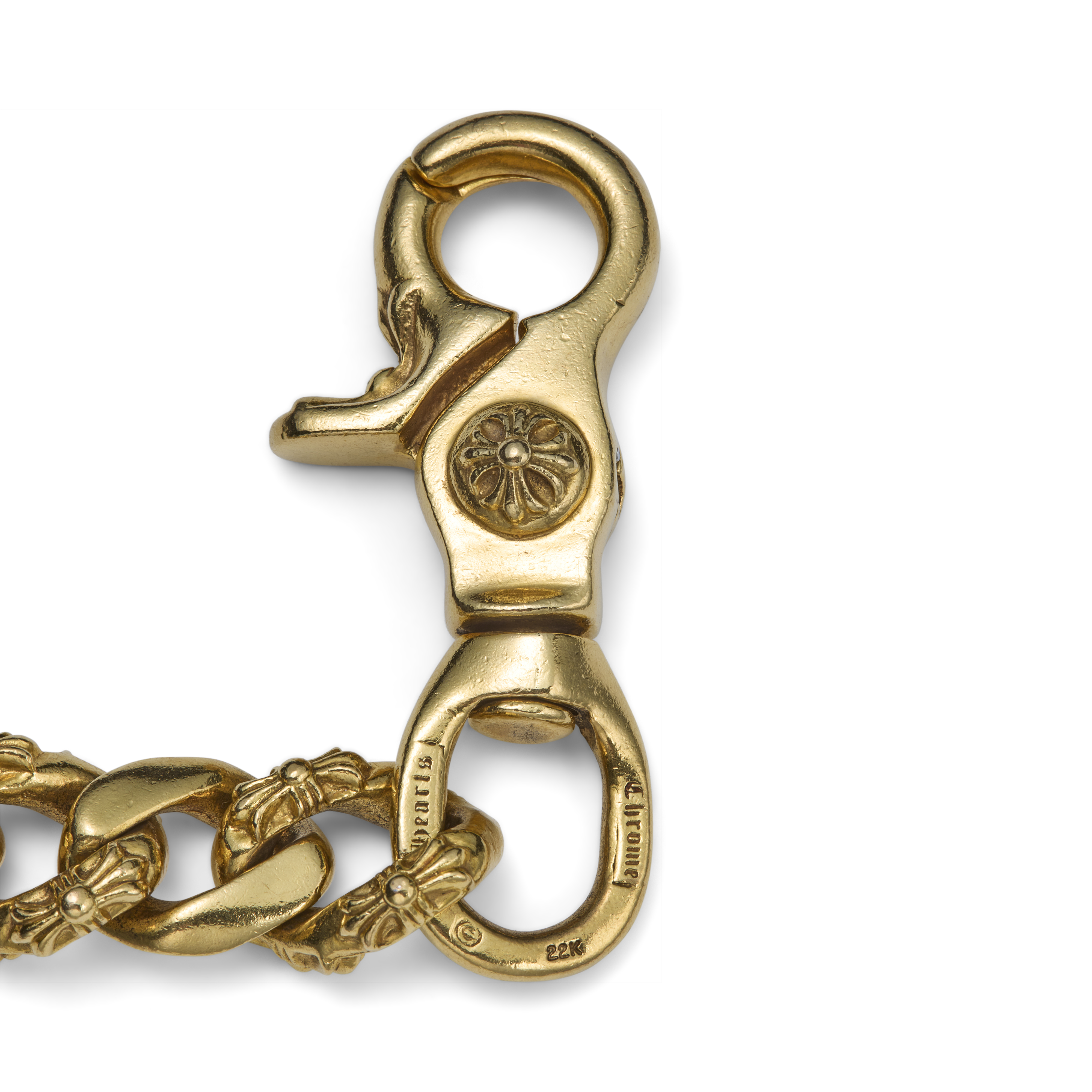 A bold expression of Chrome Hearts’ sculptural approach to adornment, this wallet chain is composed of openwork oval links in solid 22-karat yellow gold, terminating in a substantial lobster claw clasp. Measuring 19½ inches (49.5 cm) in length and weighing an exceptional 463 grams, the chain possesses a commanding physicality that asserts itself immediately on the body.