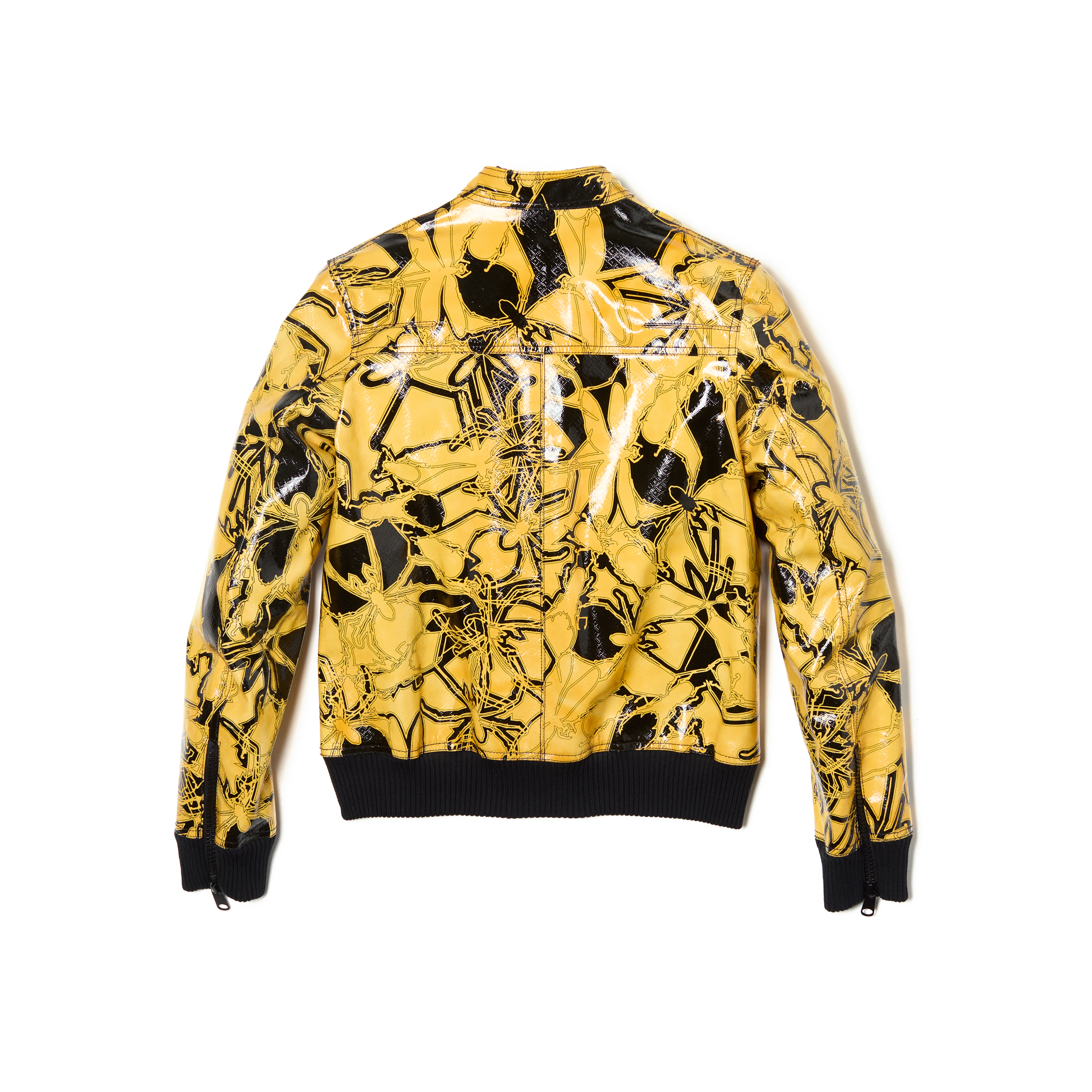 La construction de la veste est aussi luxueuse qu'elle attire l'attention. Le cuir verni lisse comme du beurre forme les empiècements avant et arrière dans un jaune brillant, bordé d'un mélange structuré de laine et de coton dans un noir de jais. Cette juxtaposition de matières crée un contraste visuel et textural dynamique. La pièce est taillée dans la silhouette cintrée caractéristique de Slimane : étroite au niveau des épaules et de la taille, ce qui permet à ce modèle saisissant d'être toujours aussi pointu et sophistiqué. Une doublure en soie assure le confort et une touche d'indulgence. Cette veste représente l'intersection de l'audace inspirée du rock et de la haute couture qui a défini l'héritage de Hedi Slimane chez Dior Homme.