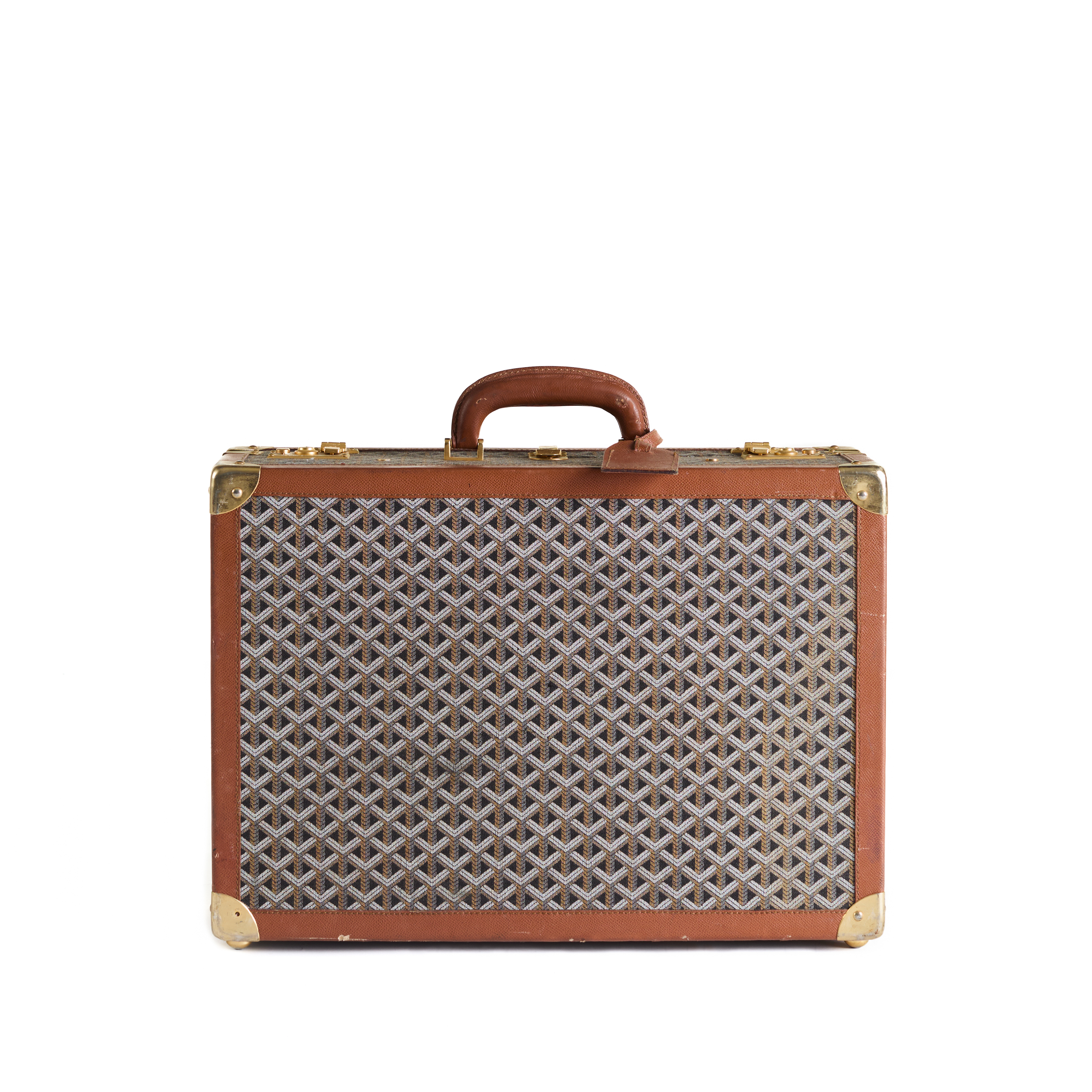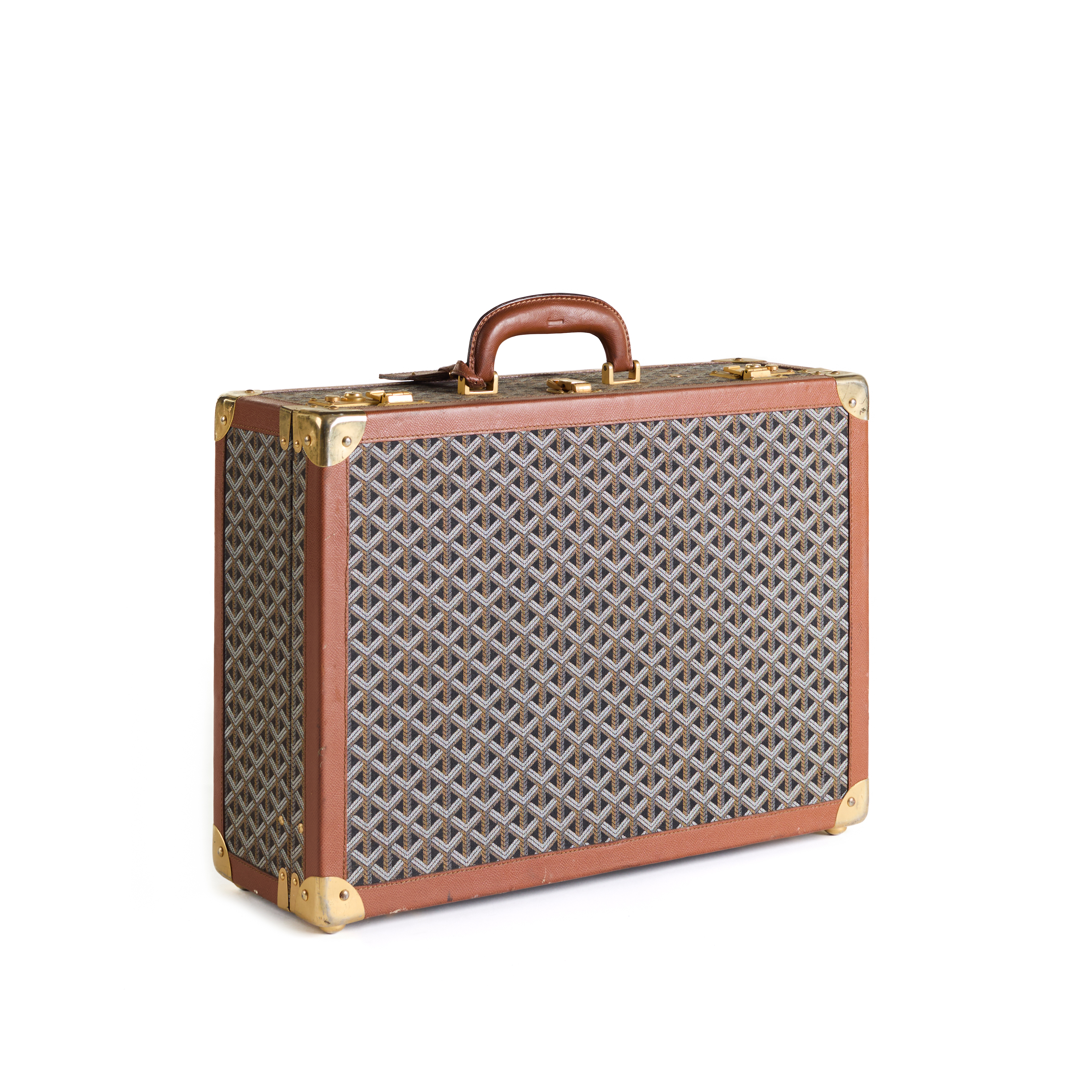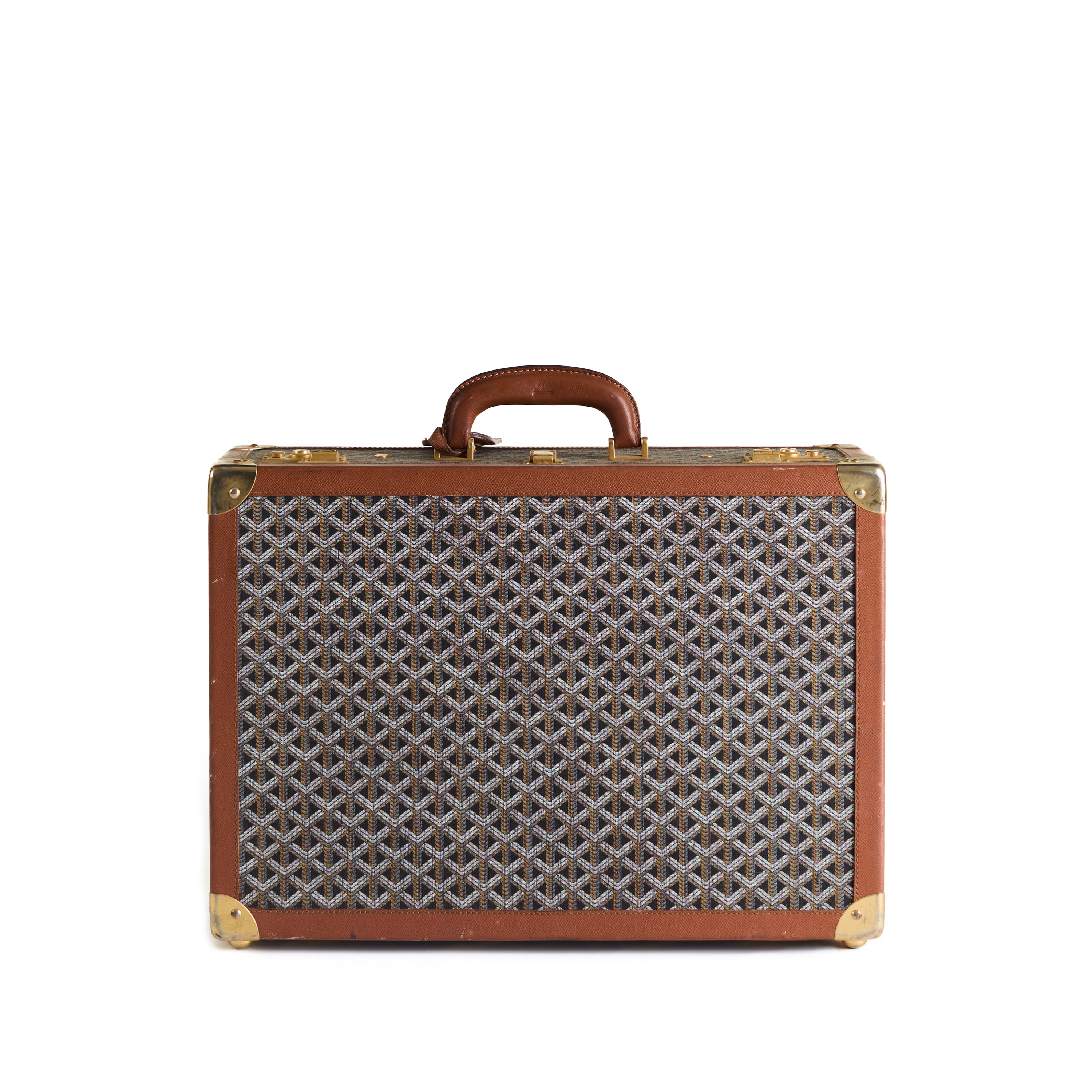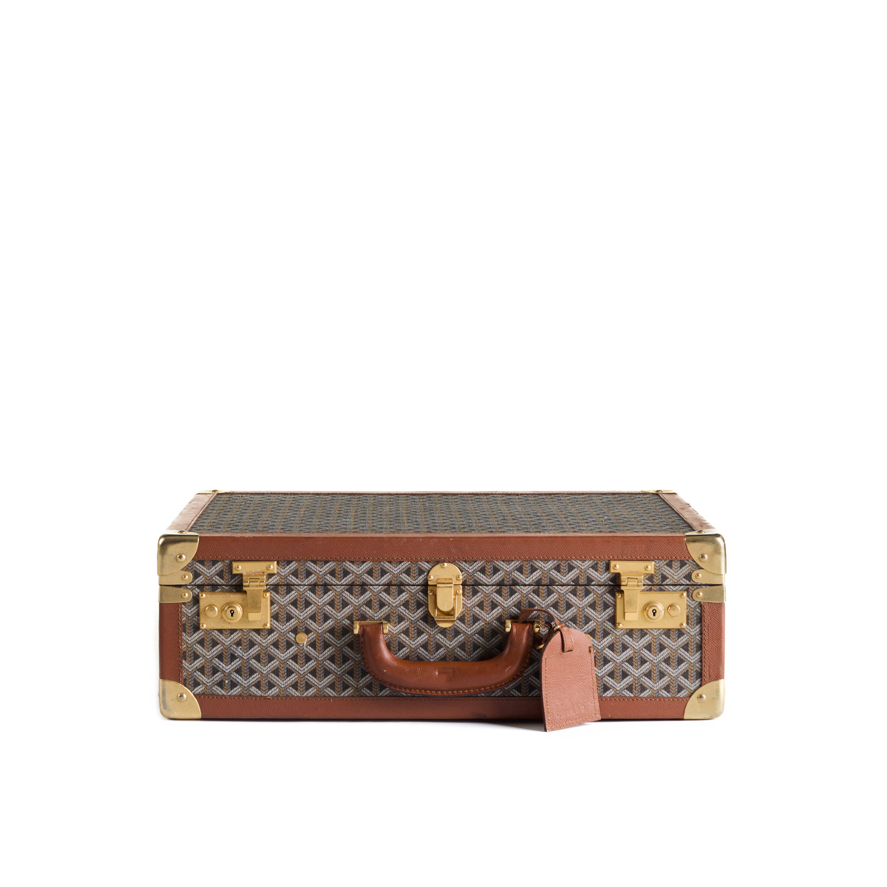 Dernier coffre compact de l'ensemble, cet exemple complète le rythme : échelle uniforme, langage des matériaux cohérent, et façonné par la même logique d'utilisation. La toile noire Goyard, les garnitures en cuir et les accessoires en métal se combinent pour former un objet à la fois pratique et discrètement élégant.