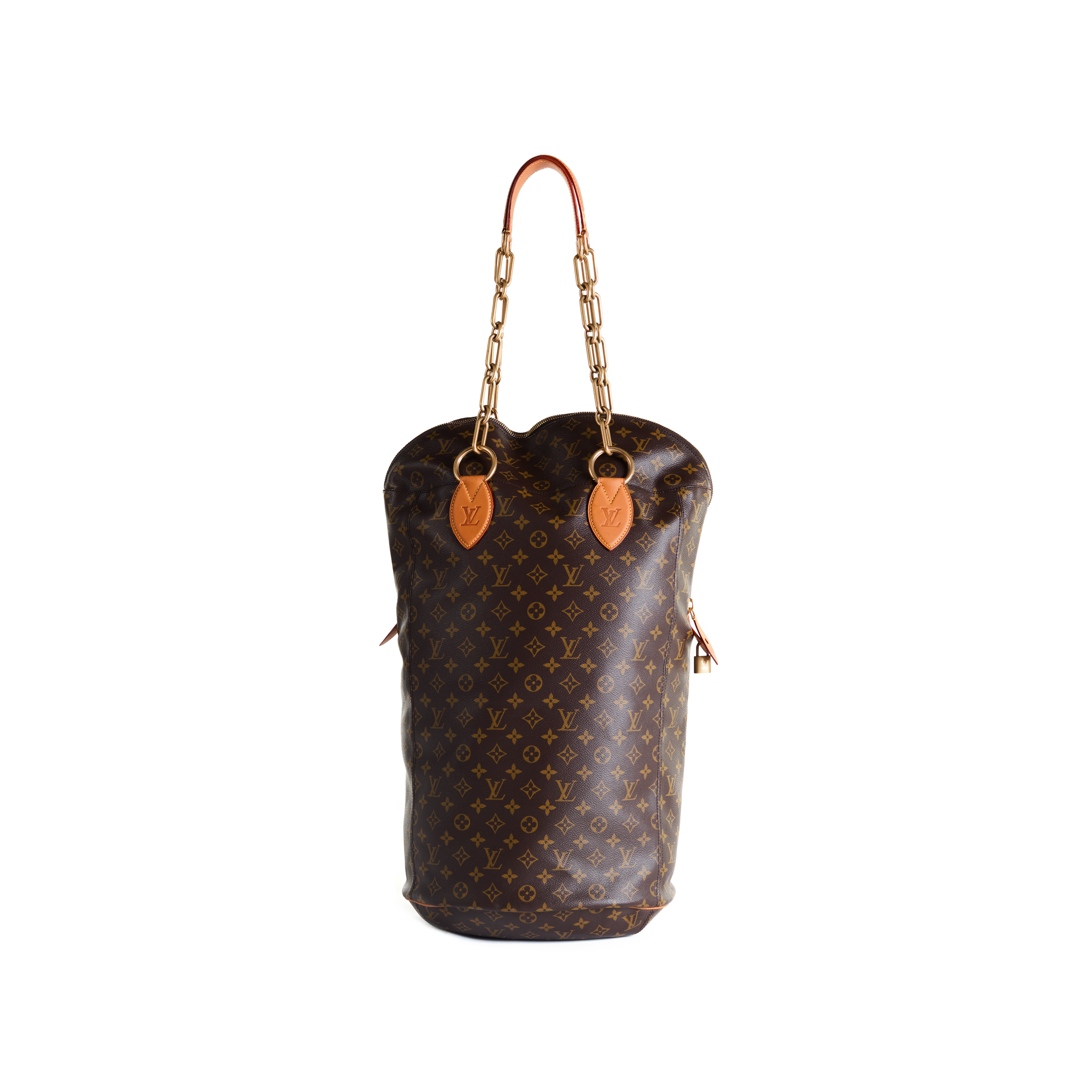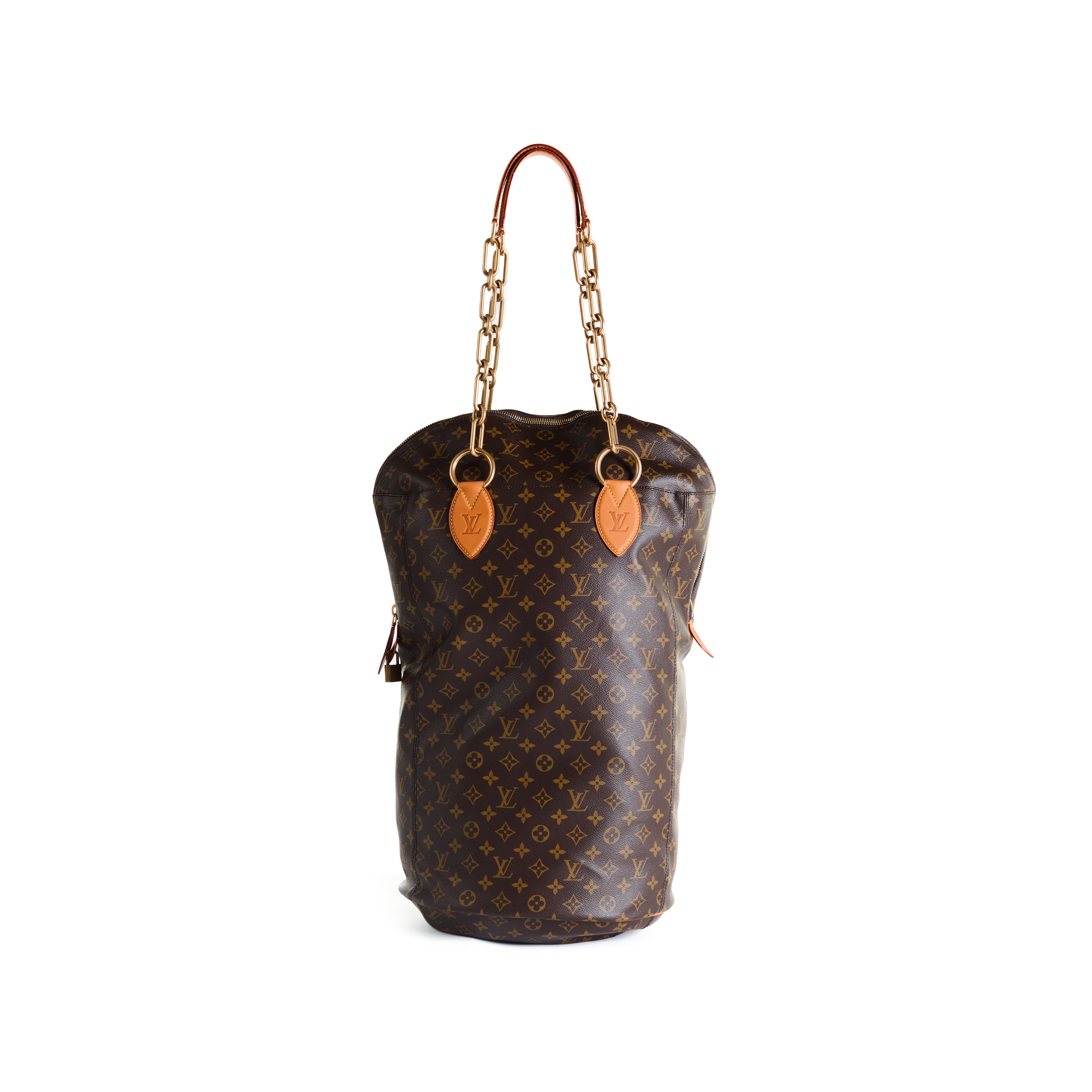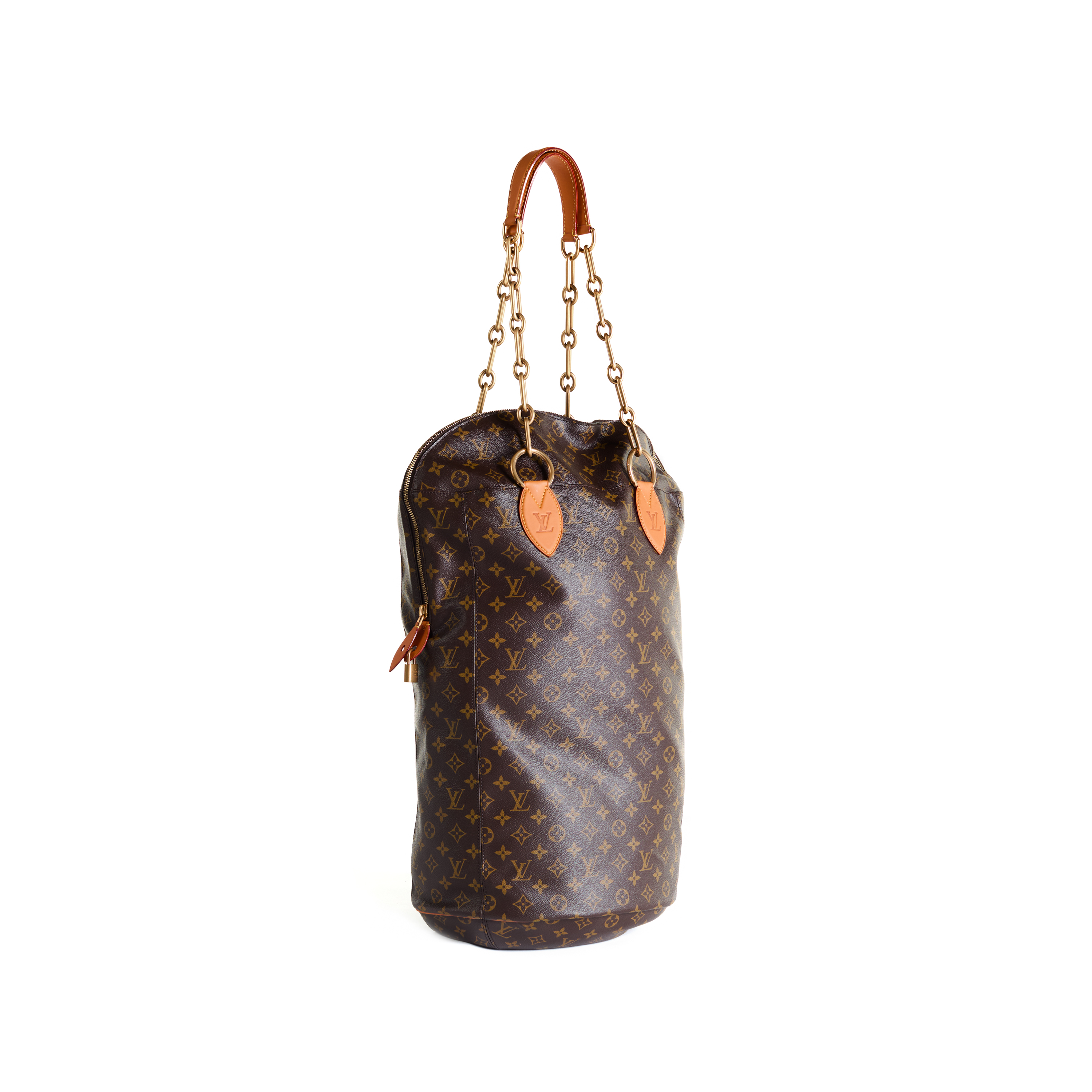 Executed in Louis Vuitton’s coated monogram canvas, the PM punching bag is rendered in a deliberately undersized form, transforming the familiar athletic object into a refined accessory. Finished with leather detailing and suspended from gold-tone brass chain handles, the piece is both sculptural and functional, capturing the essence of the original concept in miniature.