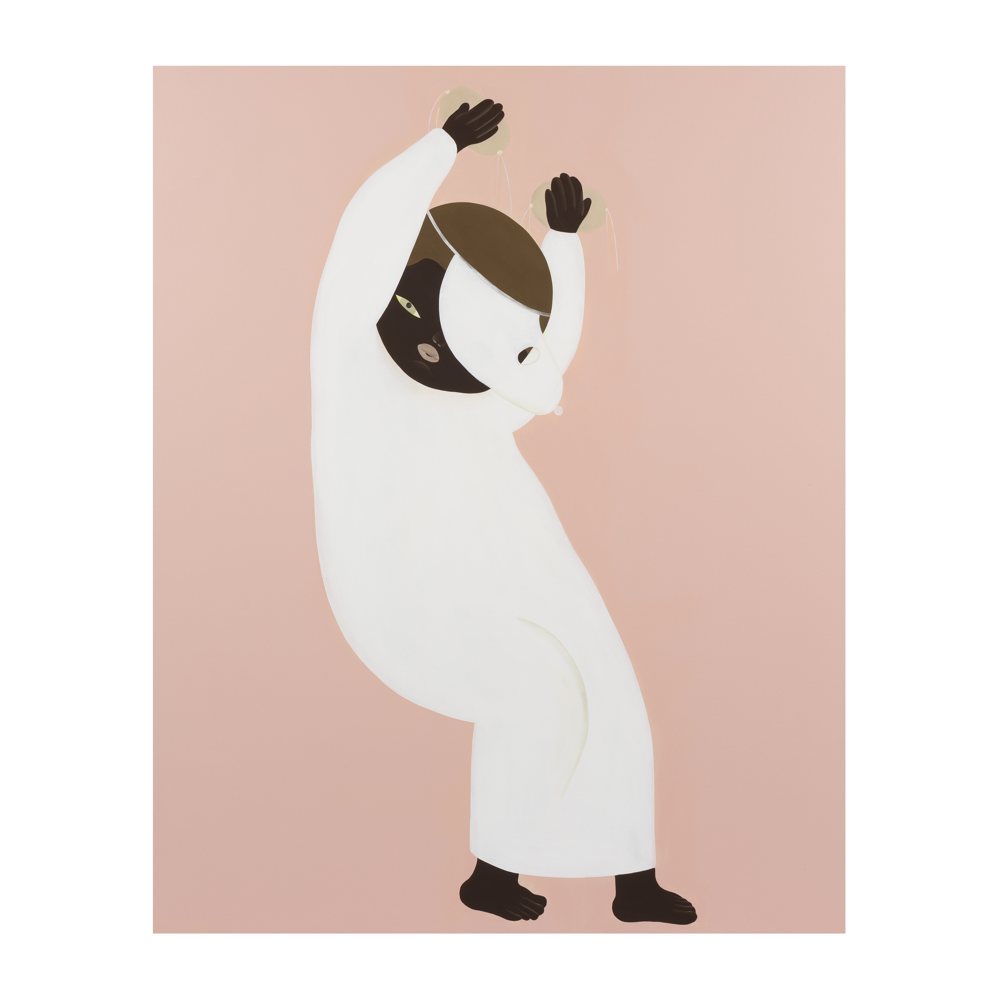 Painted in 2021, Pink exemplifies these qualities with striking clarity. Exhibited in the artist’s Los Angeles solo exhibition at Blum & Poe that same year, the large canvas presents a lone figure dressed entirely in white, set against a radiant monochrome pink background. A white headpiece obscures one eye, while the figure lifts two objects aloft in a gesture at once reminiscent of celebratory dance and ceremony. Through its chromatic simplicity and symbolic ambiguity, Pink exhibits Ogawa’s distinctive approach which interplays concealment and revelation, making it a compelling example of her contribution to contemporary figurative painting.