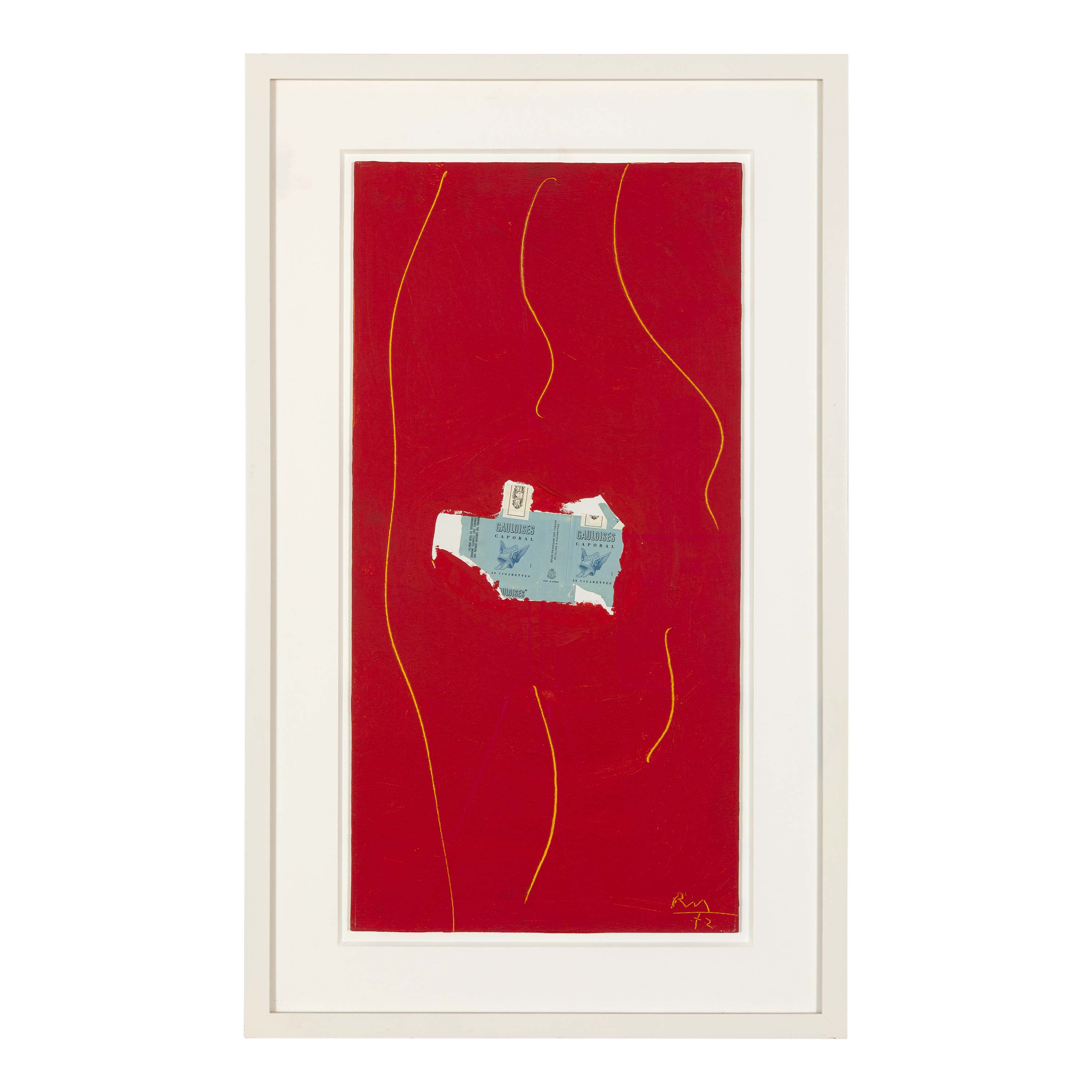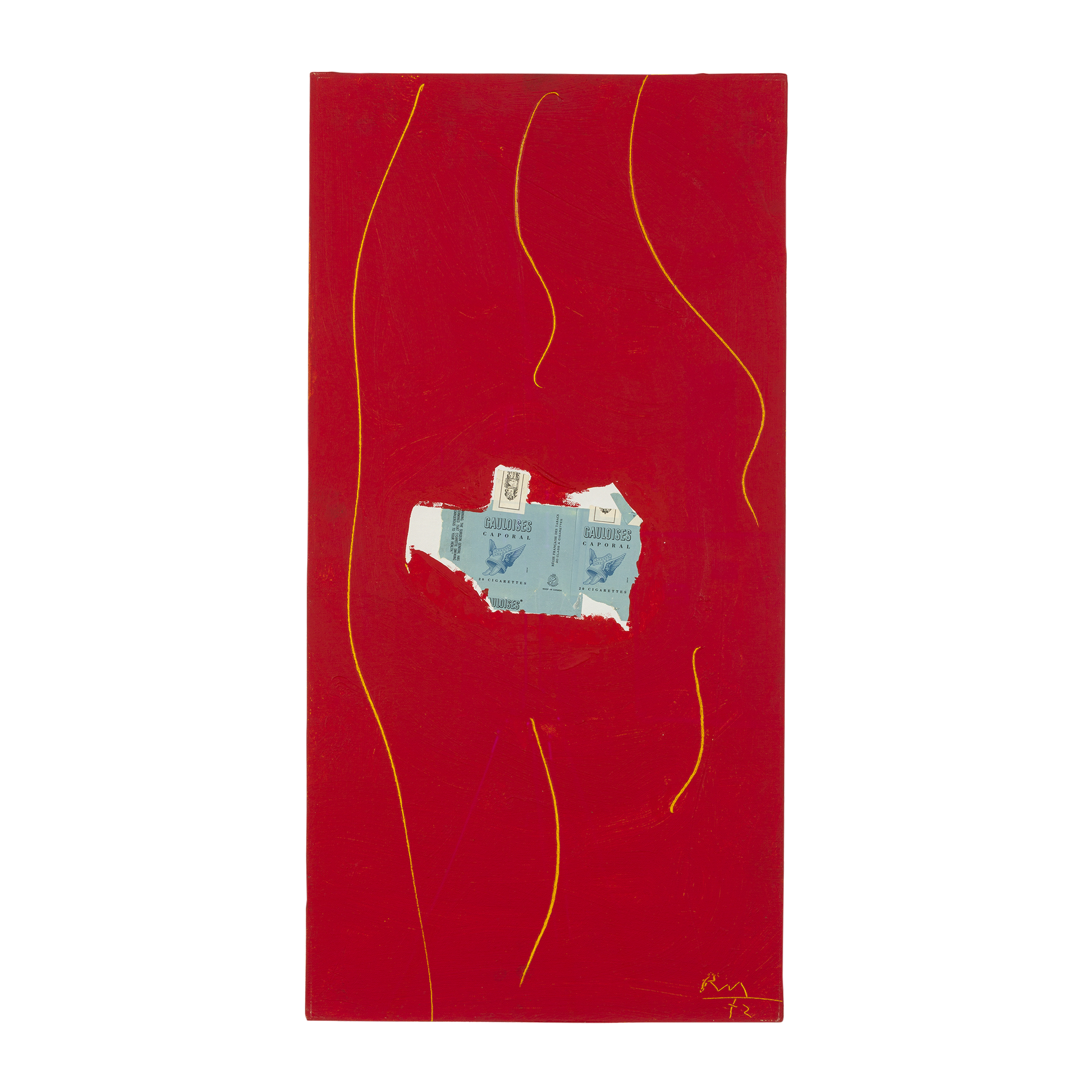 Gauloises on Scarlet over Yellow #3, executed between 1972 and 1982, epitomizes this balance. Against a field of radiant red brushed with subtle yellow, flattened blue Gauloises cigarette packages occupy the center of the composition. Their presence evokes the atmosphere of postwar Paris—the cafés of artists and writers—and pays tribute to the modernist lineage that shaped his sensibility. The serene blue forms rest upon an impassioned red ground, suggesting both dialogue and tension between intellect and instinct, Europe and America. In transforming a familiar fragment of daily life into a luminous meditation on color and meaning, Motherwell affirms his belief that abstraction can express the full range of human experience with clarity, emotion, and grace.