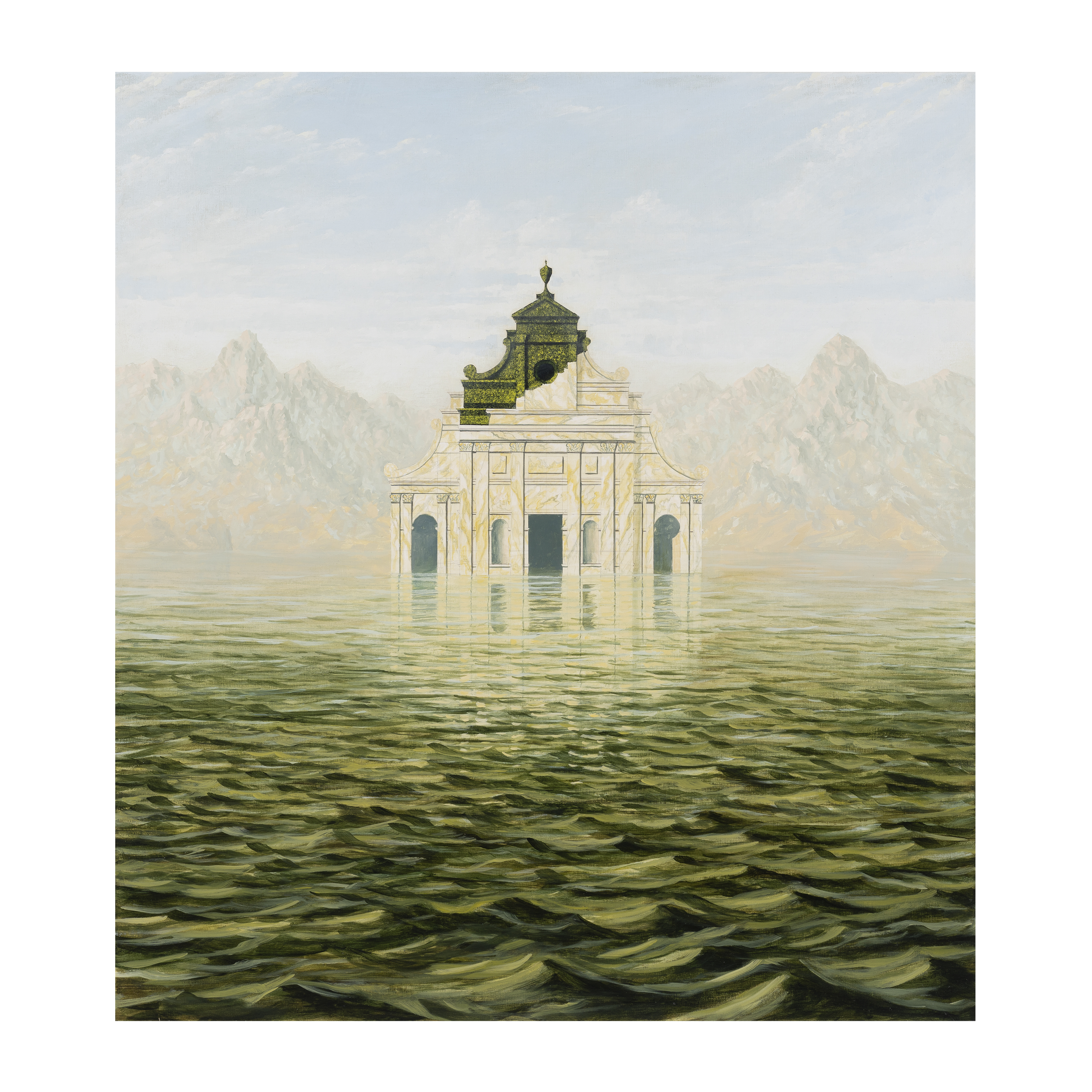 Ship of Fools IX, painted in 2022 as part of his celebrated series exhibited at Hannah Barry Gallery in London, embodies this vision. At the center of the composition stands a symmetrical classical building rising from a tranquil green landscape. The viewer first perceives an image of calm order, but slowly the balance begins to shift. The lower portion of the structure is submerged beneath a reflective watery greenscape, while its upper edges are gradually overtaken by creeping foliage. In the distance, mountains shimmer in pale light, creating an atmosphere of majesty tinged with dissolution. What begins as a vision of control becomes an image of surrender. Nature, luminous and unrelenting, enfolds the manmade form in a quiet act of reclamation.
