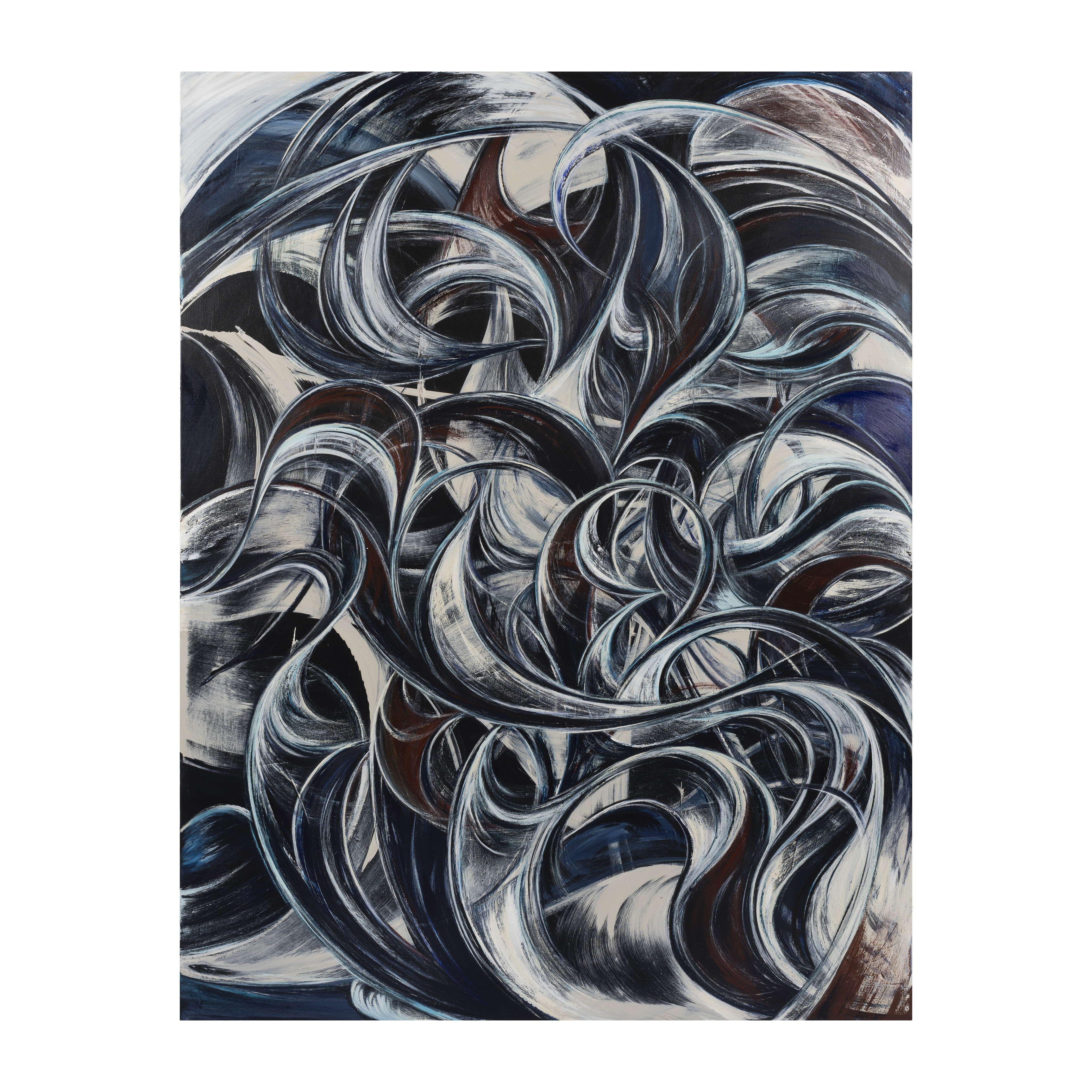 Painted in 2023, Rising Tide 01 exemplifies this dynamic equilibrium. The canvas is rendered in a palette of deep blues, blacks, whites, and reddish browns, its surface animated by swirling, interlaced strokes that appear both spontaneous and carefully constructed. The energy of the brushwork recalls the gestural vigor of Abstract Expressionism—artists such as Jackson Pollock and Lee Krasner, whom Fang cites as formative influences—yet the composition remains distinctly her own. The result is a painting that feels at once kinetic and contemplative, where layered motion becomes a metaphor for persistence and renewal.