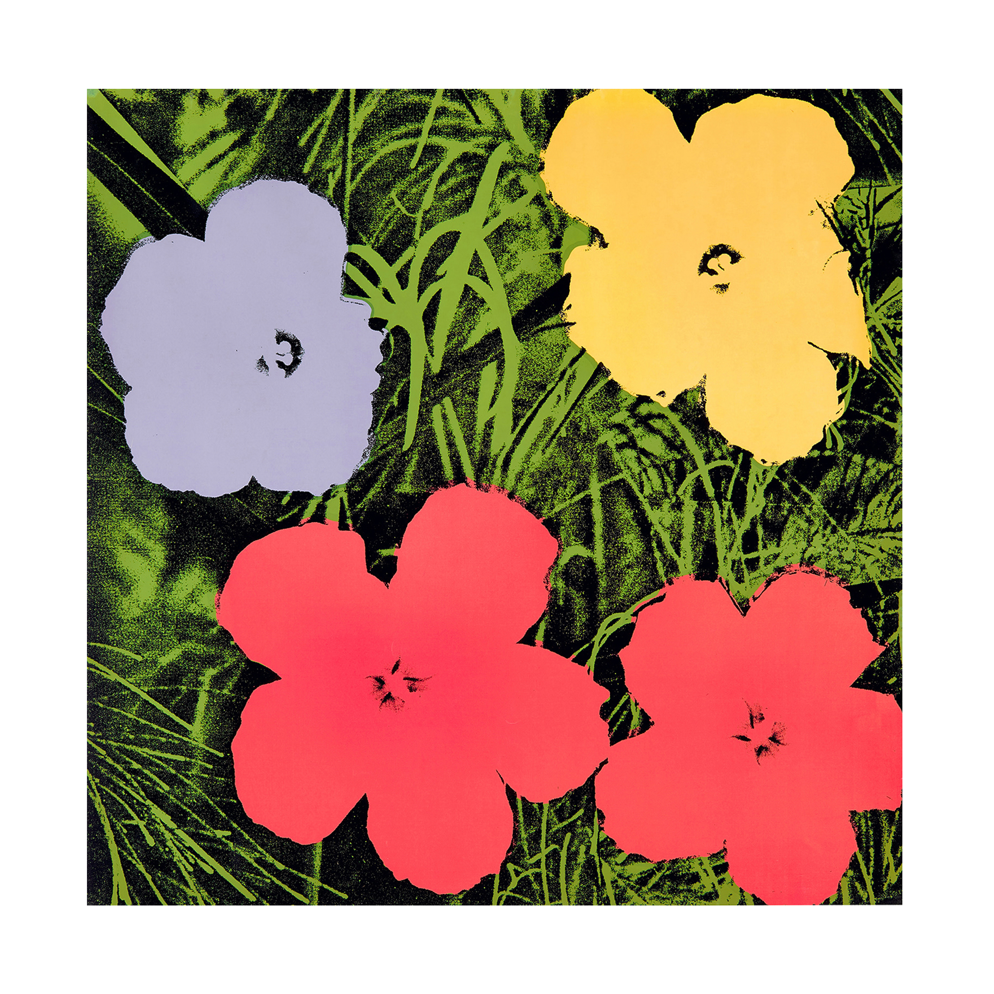 Warhol’s Flowers series stands among his most celebrated explorations of beauty, repetition, and impermanence. Based on a color photograph of seven hibiscus blossoms by Patricia Caulfield for Modern Photography magazine, the image was radically transformed through cropping, bold color, and silkscreen translation—alterations that nevertheless resulted in a landmark 1966 copyright lawsuit won by Caulfield. First exhibited at the Leo Castelli Gallery to immediate sell-out success, Flowers remains one of Warhol’s most enduring and widely reproduced series, deeply embedded in fashion, advertising, and popular culture.