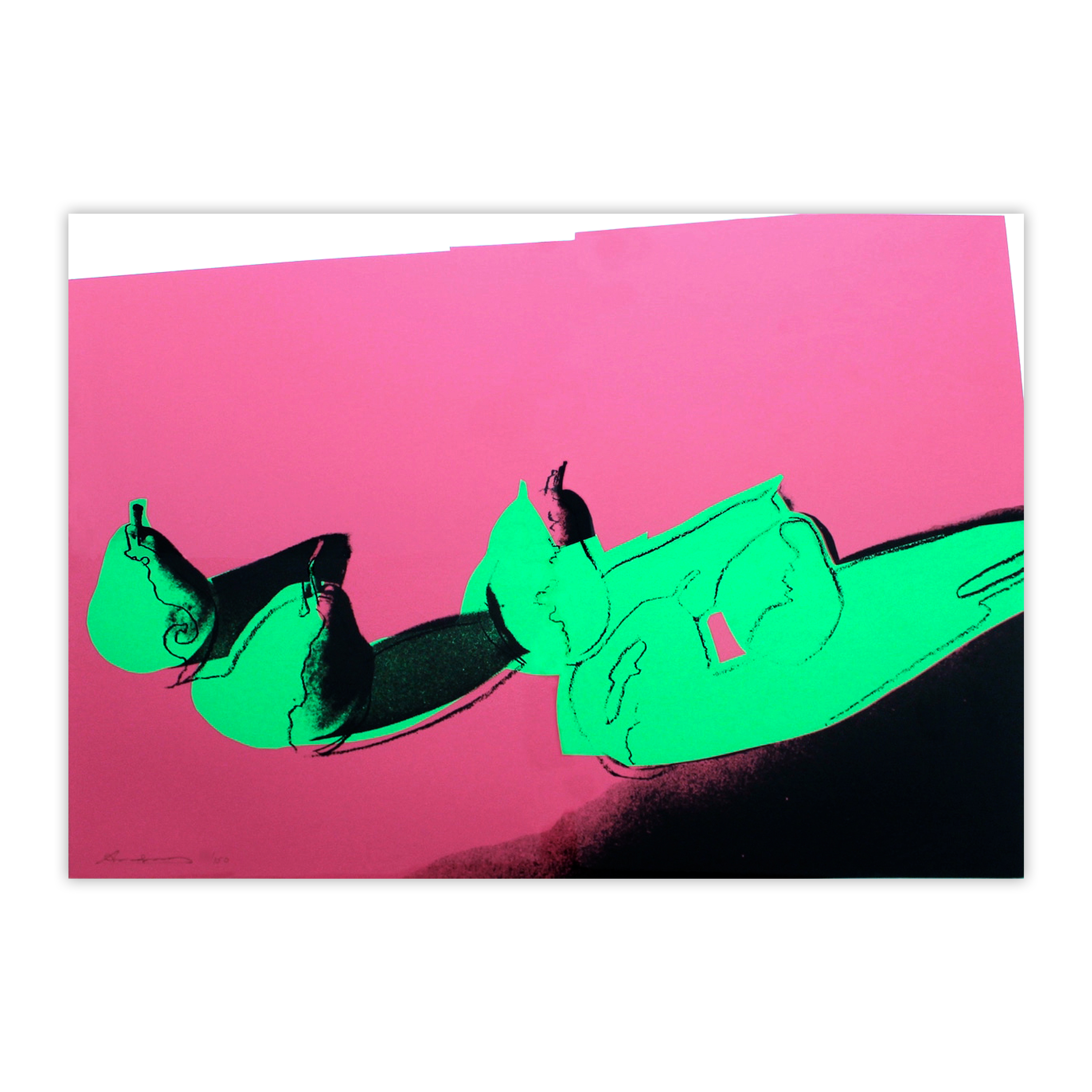 Warhol’s Space Fruit: Pears continues Warhol's exploration of everyday objects rendered strange through color, scale, and isolation. Floating against a simplified ground, the pears are transformed from familiar produce into bold, graphic forms that echo the visual language of advertising. The work underscores Warhol’s fascination with consumption and display, elevating ordinary fruit into icons of contemporary Pop imagery.