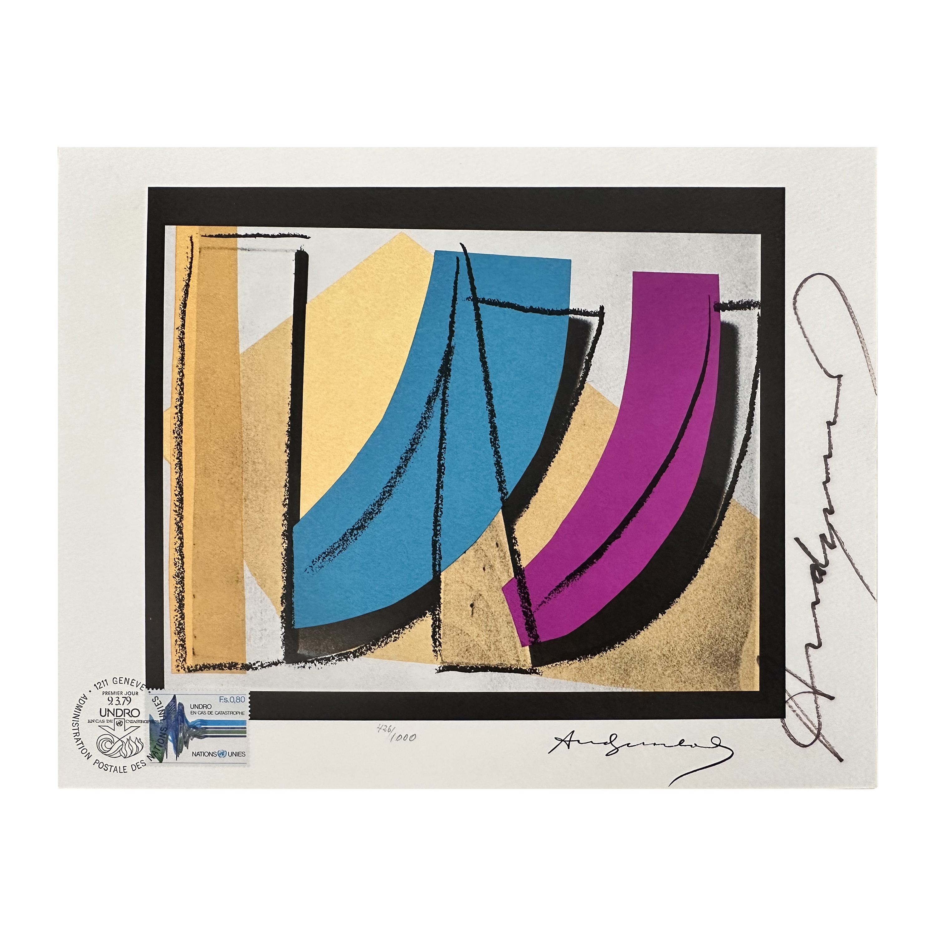 Created to commemorate the 35th anniversary of the United Nations, Warhol’s U.N. Stamp translates a symbol of global diplomacy into the visual language of Pop Art. Using bold color and graphic simplification, Warhol elevates the postage stamp—an everyday vehicle of communication—into a work that reflects his fascination with circulation, authority, and mass distribution. The print underscores Warhol’s belief in images as powerful tools of visibility, capable of carrying political meaning across borders and cultures.