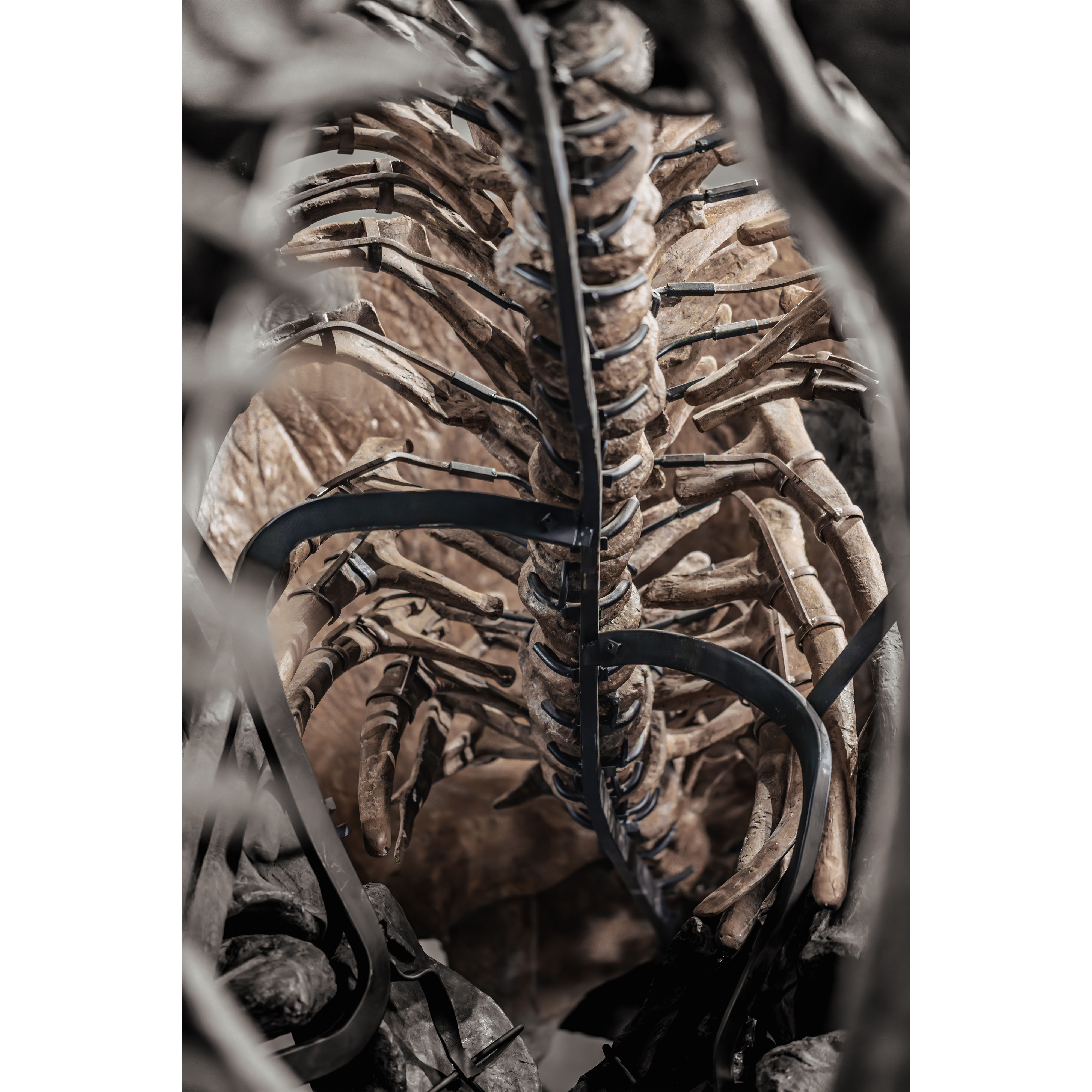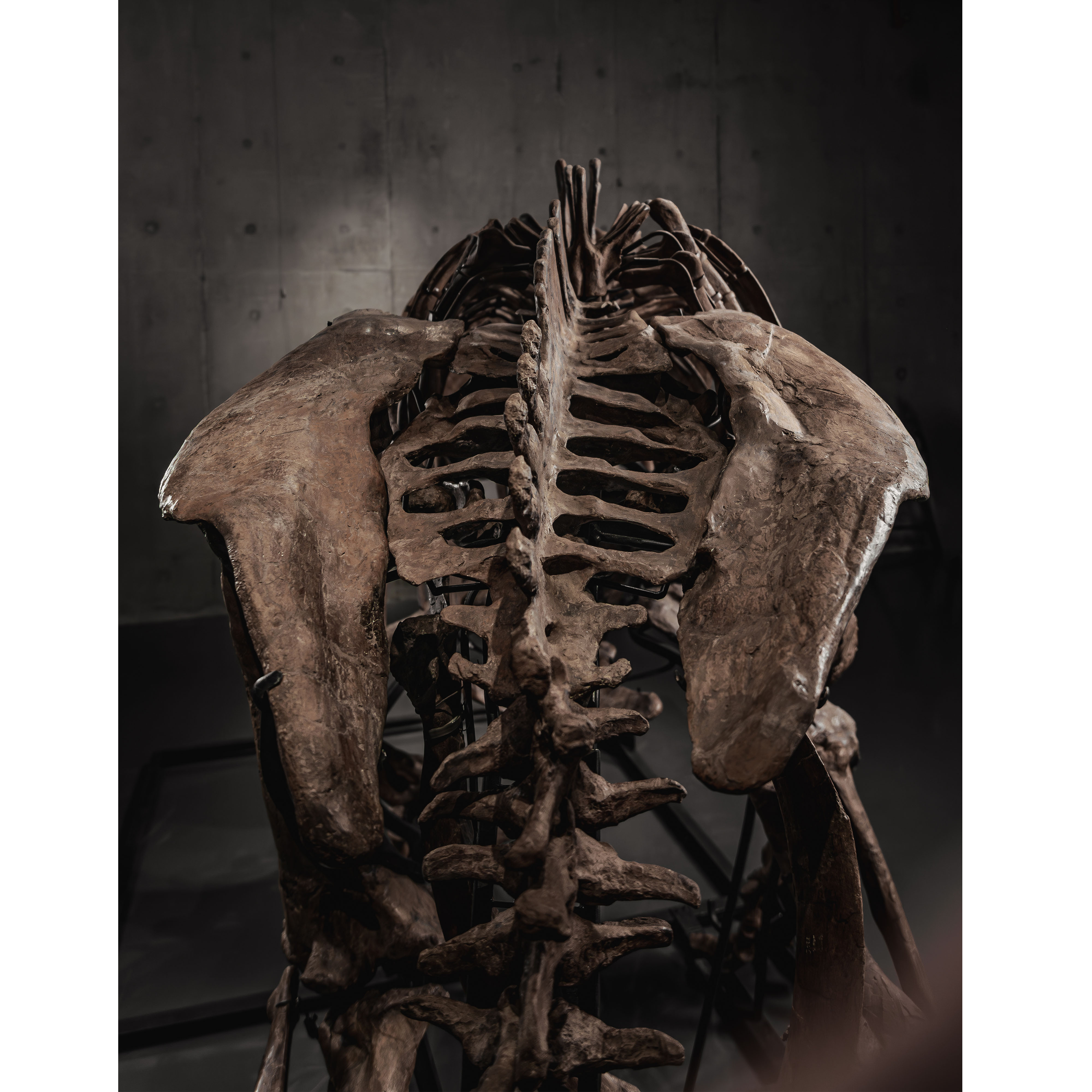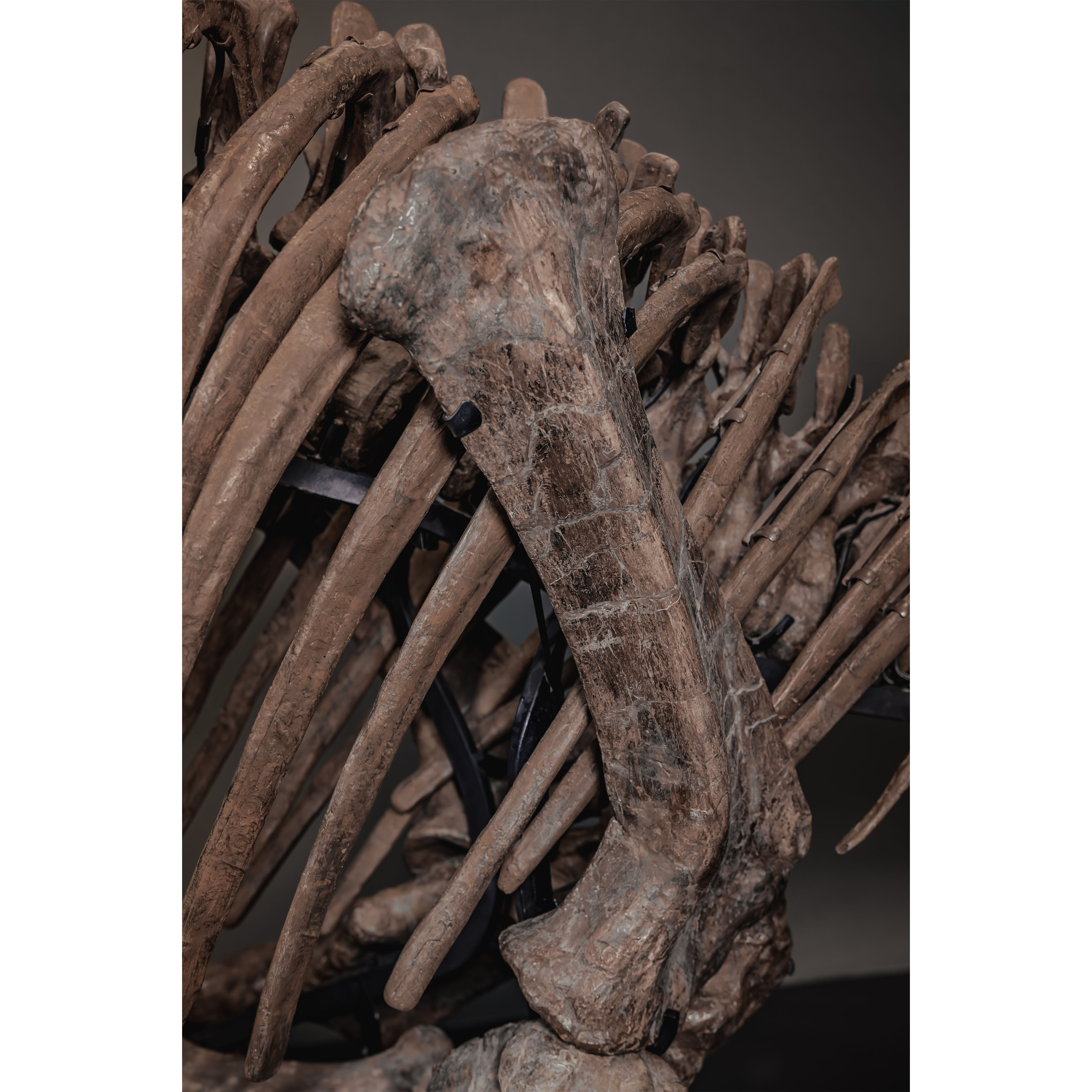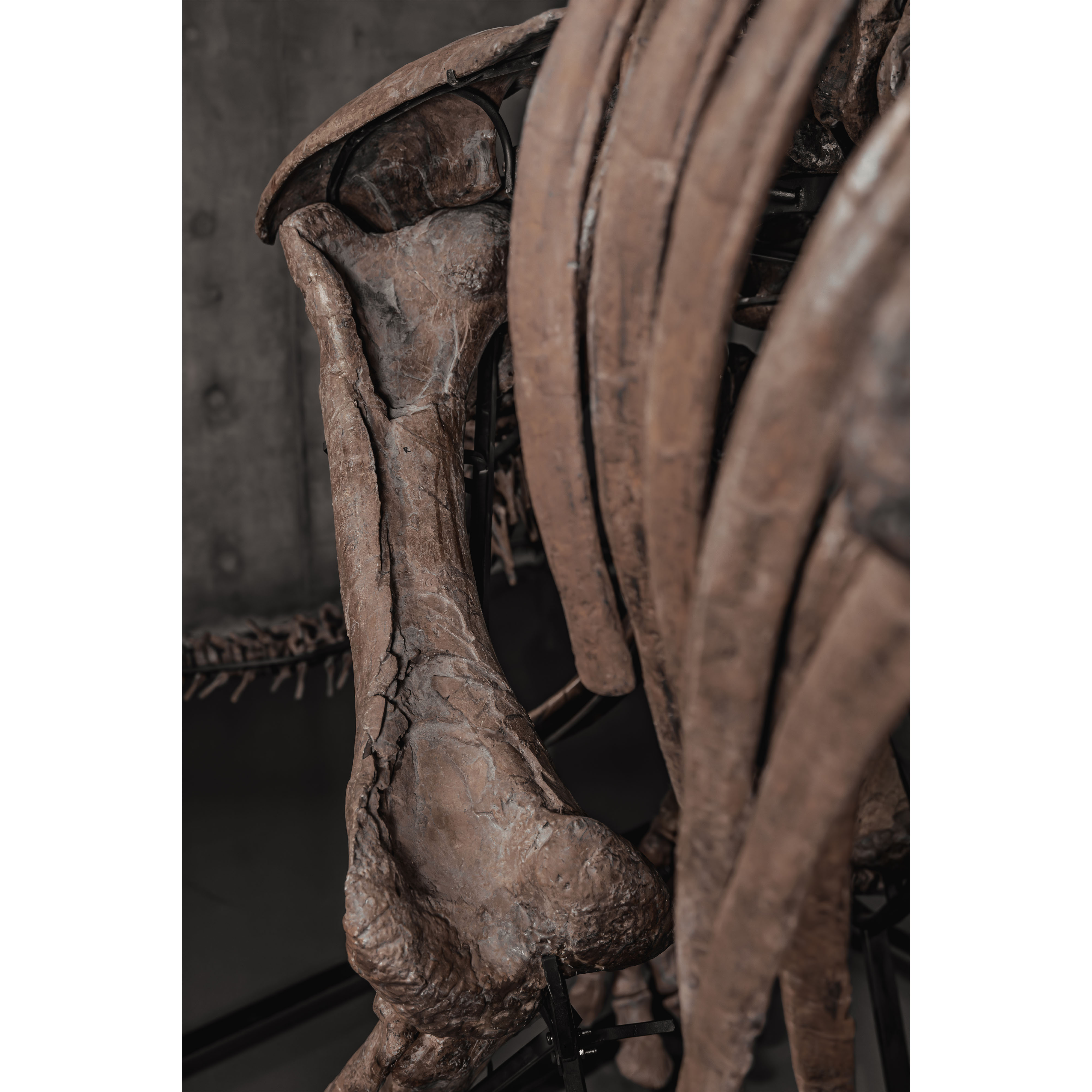 Trey’s classical mounting style preserves an important chapter in the art of dinosaur display. The dynamic pose captures the specimen’s presence, while mineral replacement over millions of years—groundwater and iron-rich minerals gradually replacing organic material—has painted the skeleton in warm earth tones, creating natural surface complexity on a once-living structure. Trey’s sub-adult scale remains visually commanding while adaptable for display in a wide range of public or private spaces.