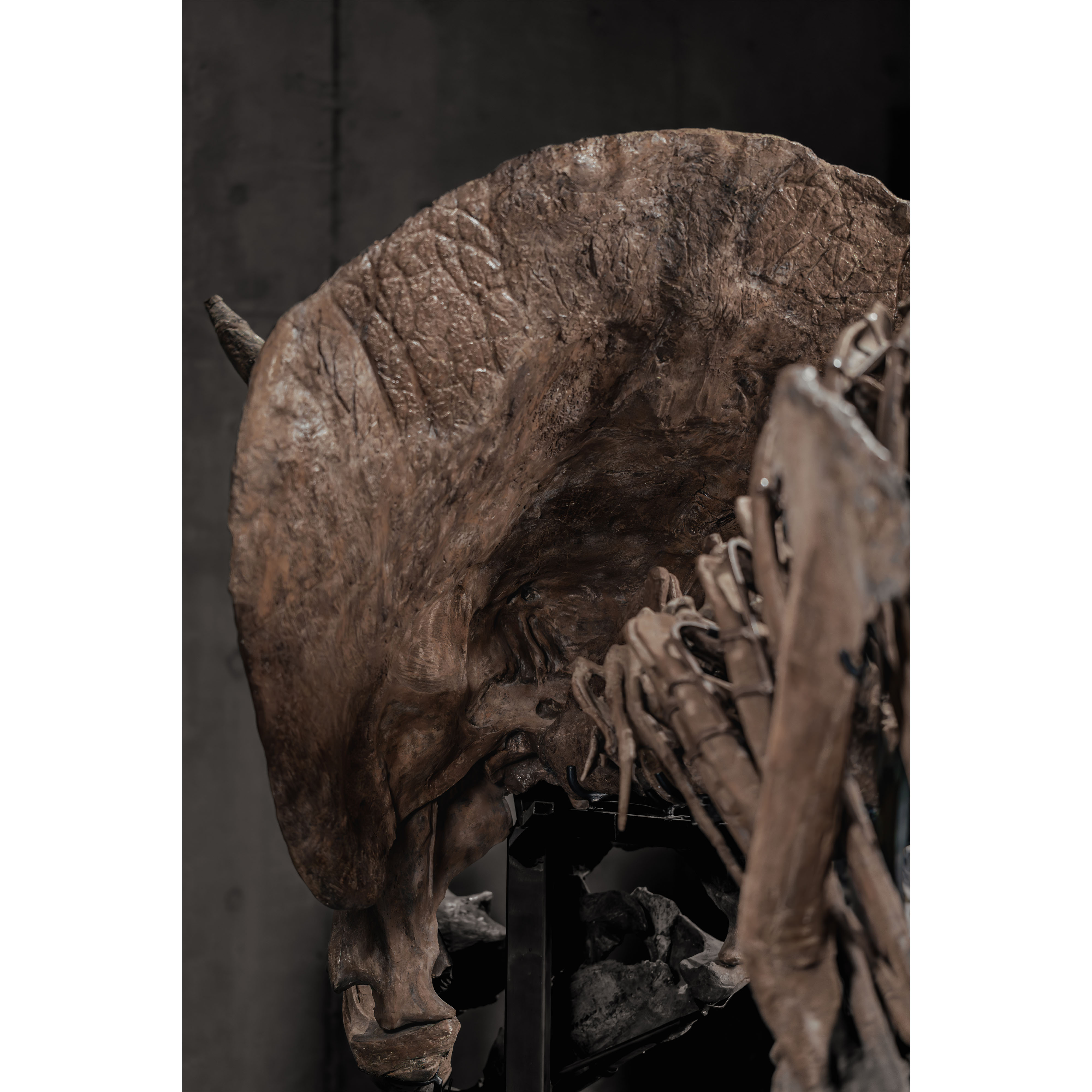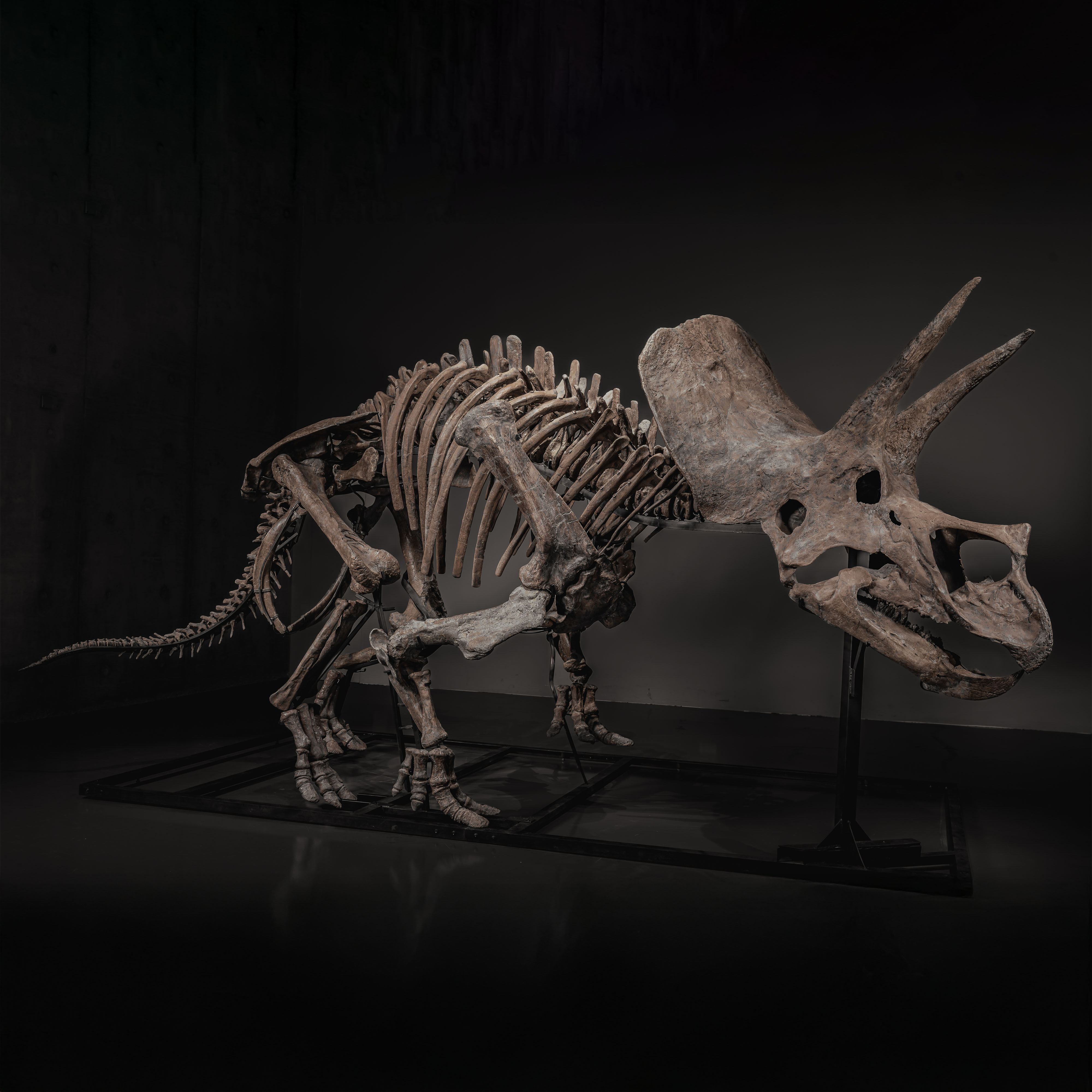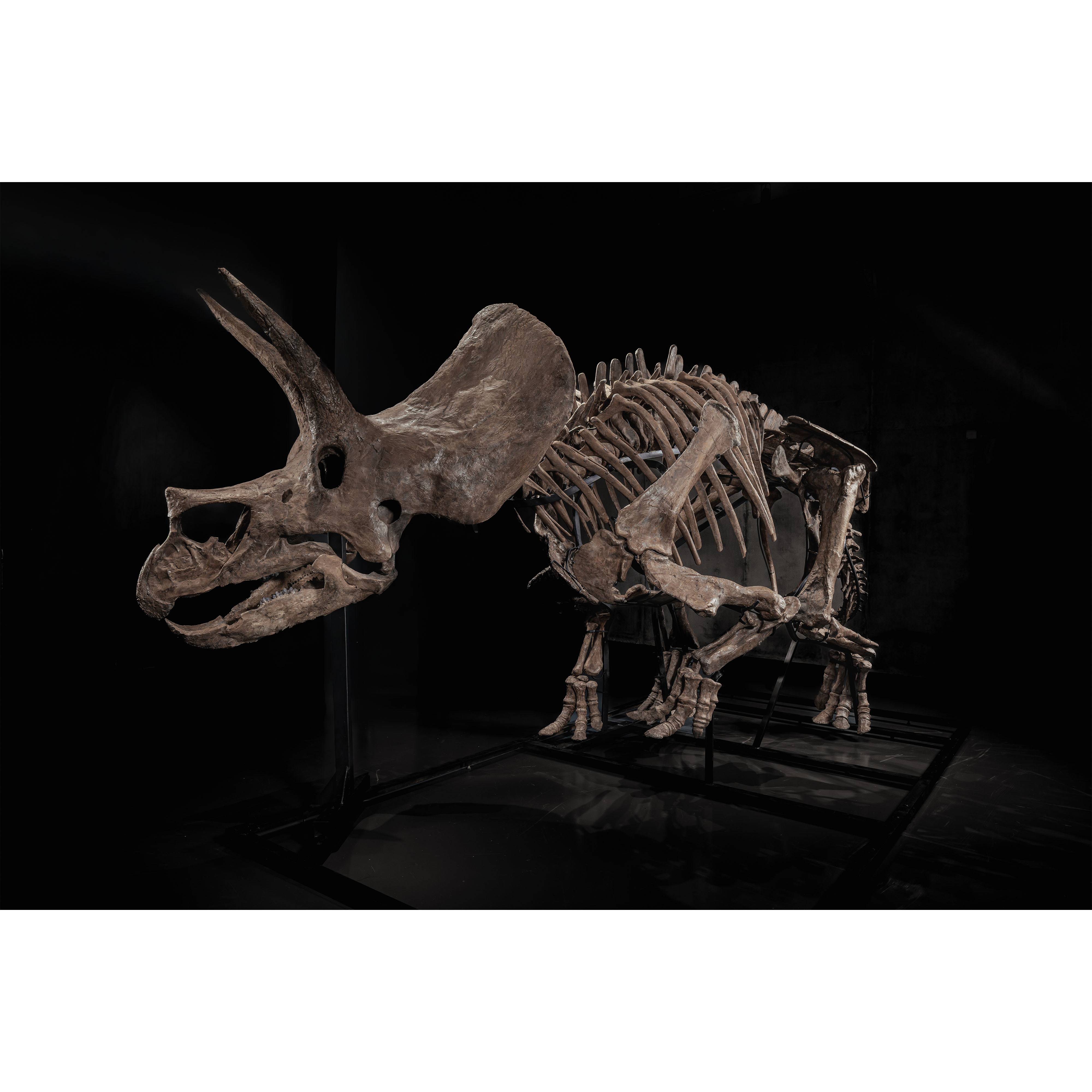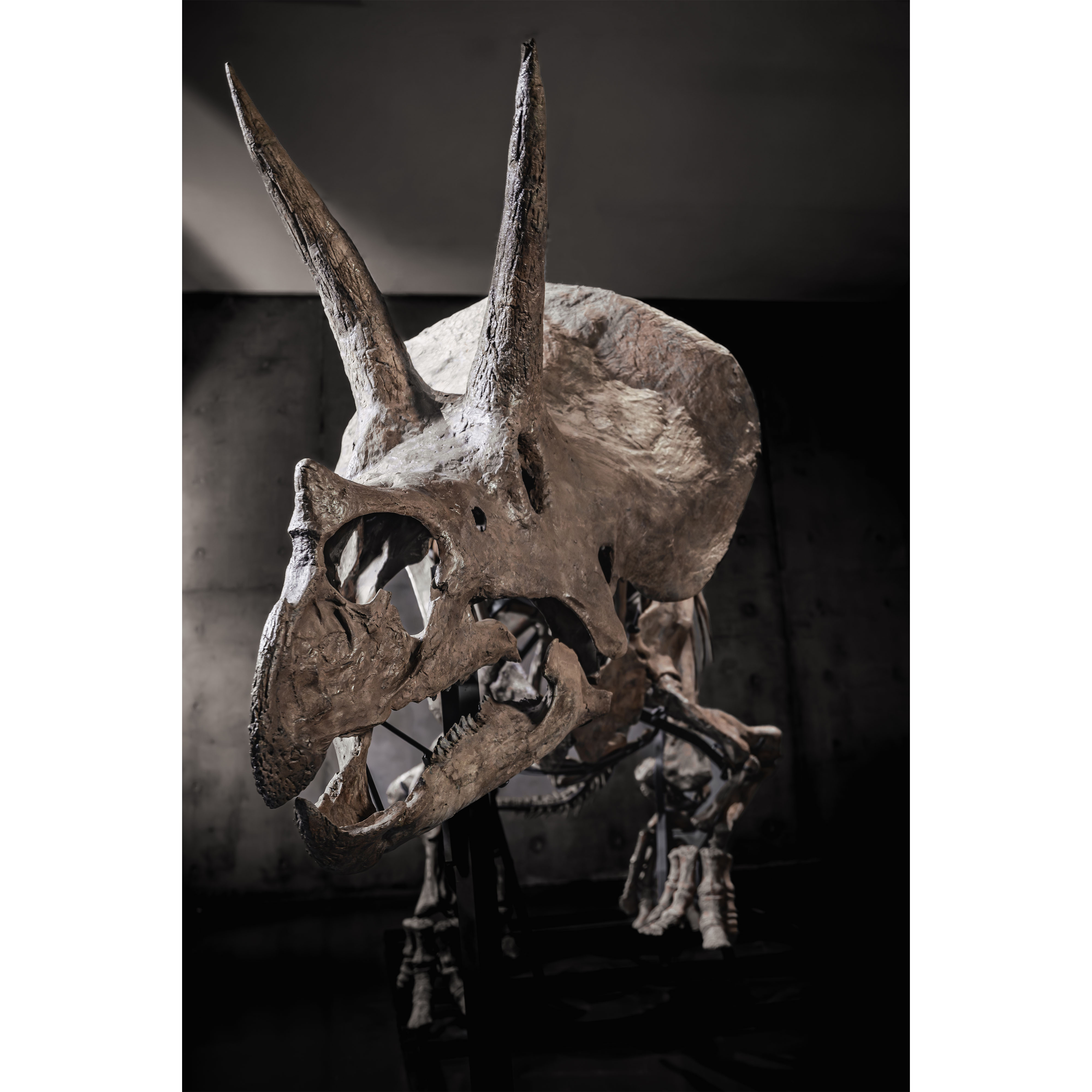 Specialist assessment supports Trey as a sub-adult to young adult individual. Dr. Frederic Lacombat noted: “The individual is a sub adult, the epoccipital bones that ornament the top of the frill are not present or fused yet due to its young age.” Andre LuJan added: “An examination of the skull and axial skeleton supports that this Triceratops is a young adult with plenty of room to grow.”